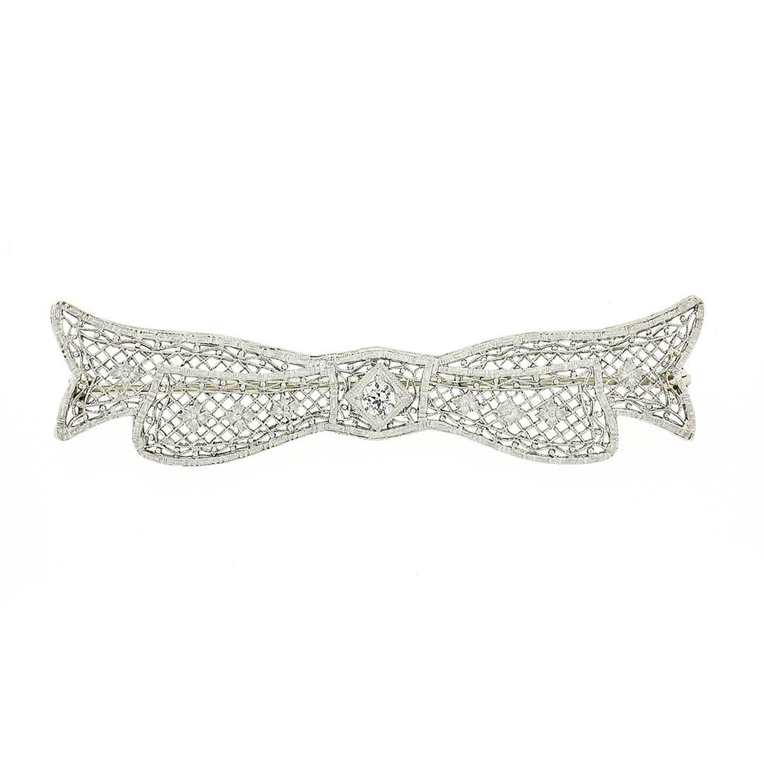 A antique solid 14k white gold bow pin brooch, with 1 old european cut natural diamond (H - VS1 ; 0.15ct ). Measures 14.40x58.45mm and weighs a total of 4.87 grams.