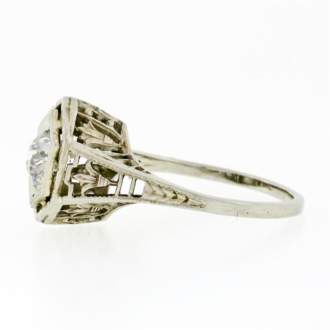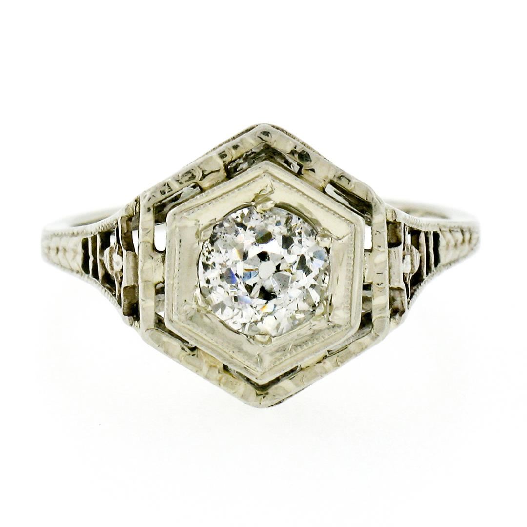 An antique solid 14k white gold solitaire ring, with 1 old european cut natural diamond (H - SI2; 0.54ct). The ring is size 4.5, weighs a total of 2.50 grams, and measures 10.93mm wide.