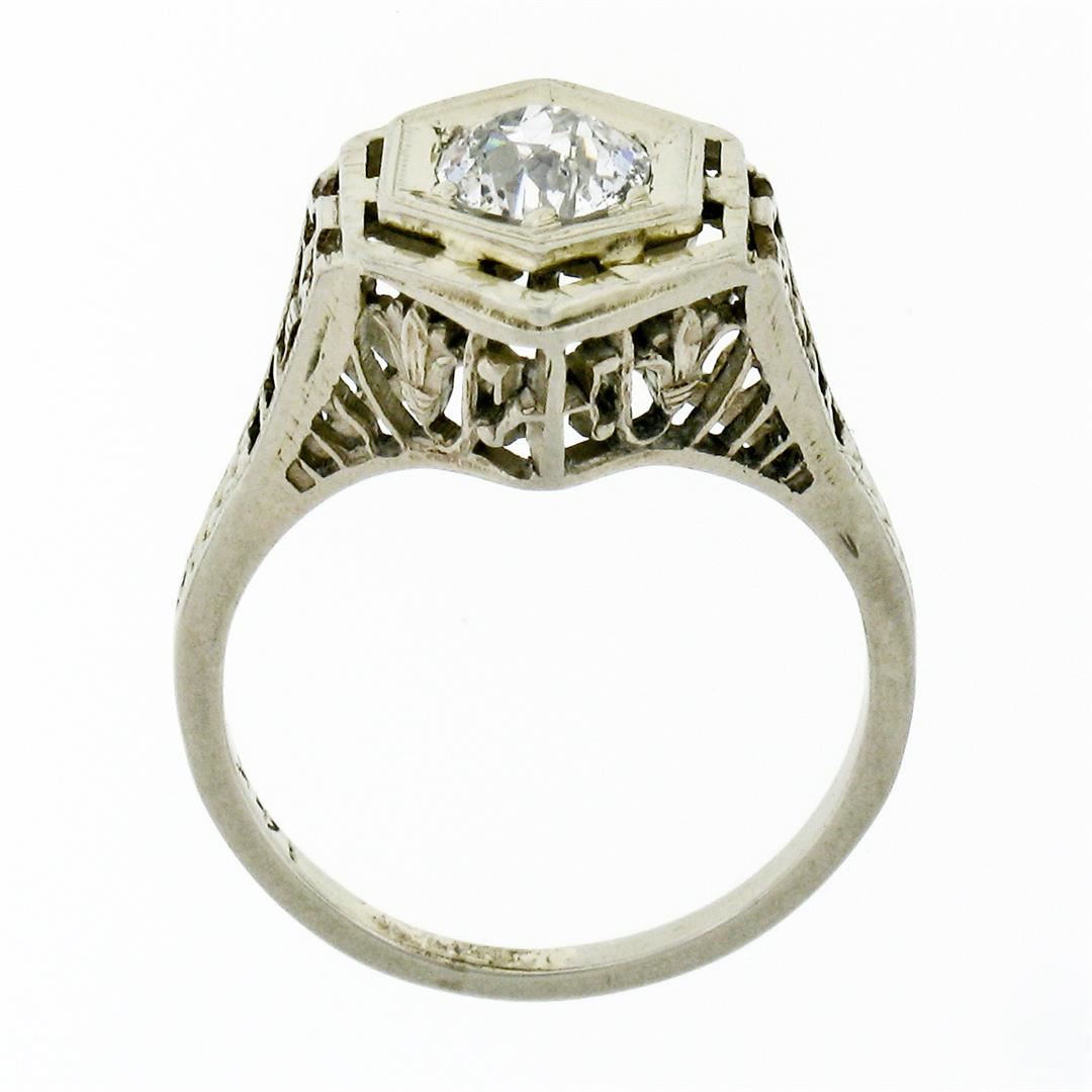 An antique solid 14k white gold solitaire ring, with 1 old european cut natural diamond (H - SI2; 0.54ct). The ring is size 4.5, weighs a total of 2.50 grams, and measures 10.93mm wide.