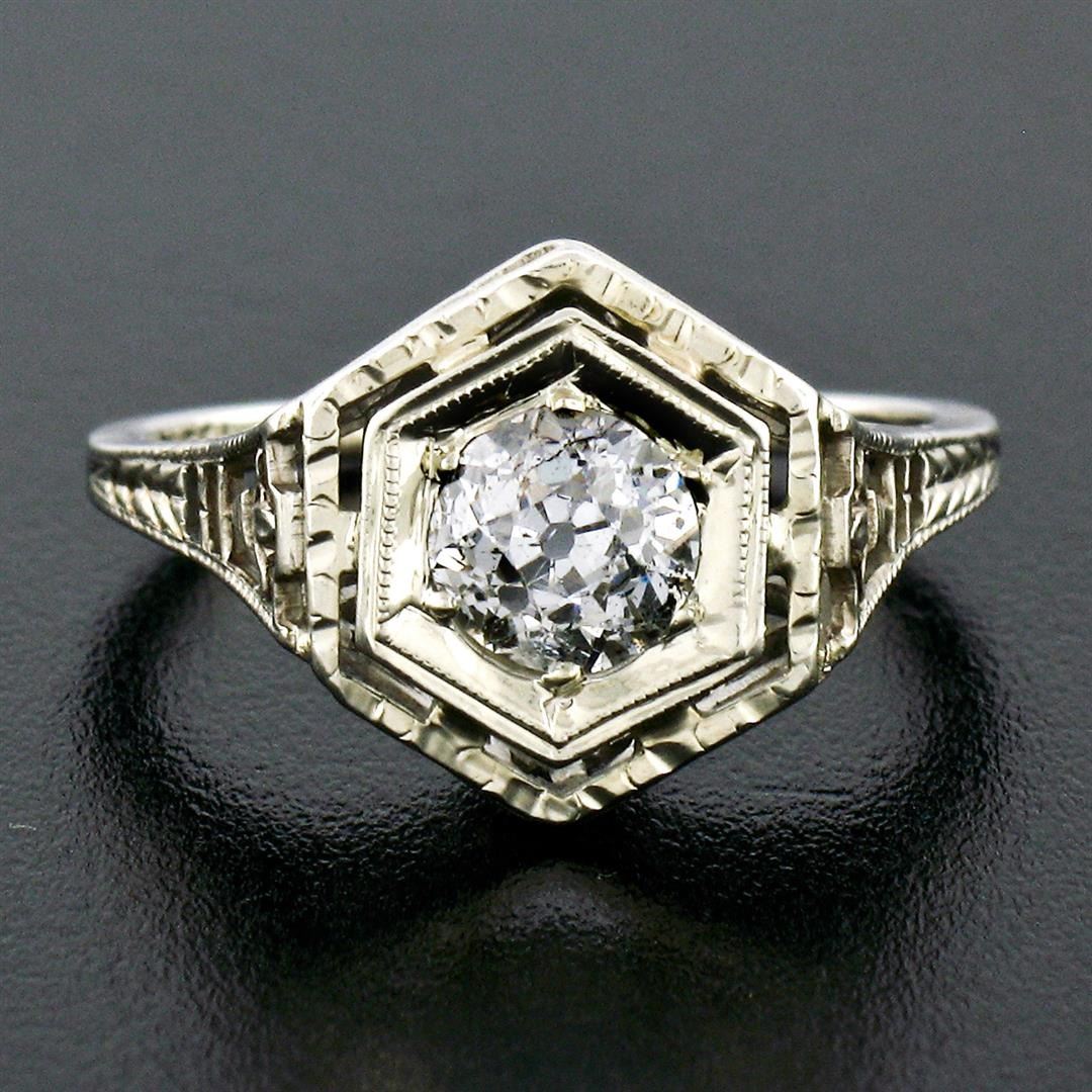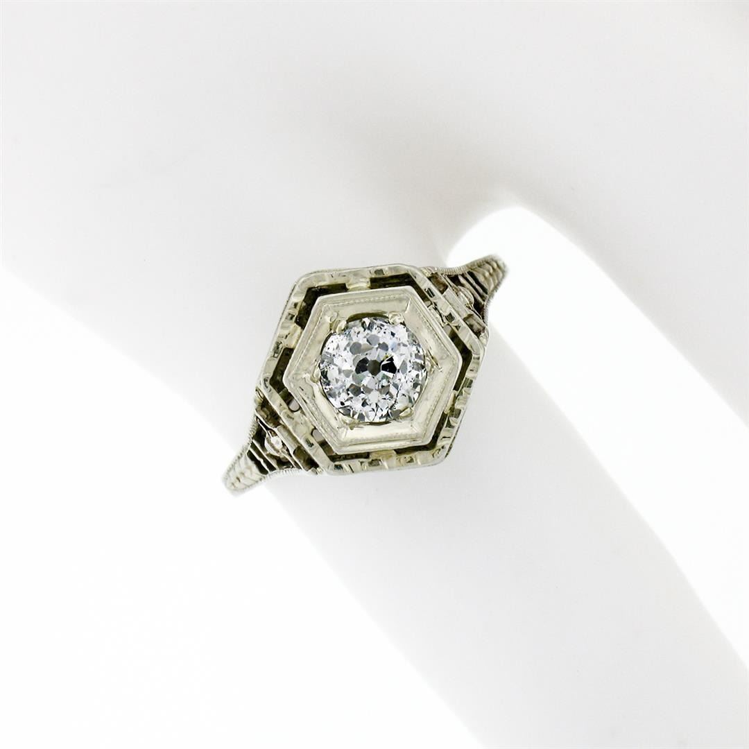 An antique solid 14k white gold solitaire ring, with 1 old european cut natural diamond (H - SI2; 0.54ct). The ring is size 4.5, weighs a total of 2.50 grams, and measures 10.93mm wide.