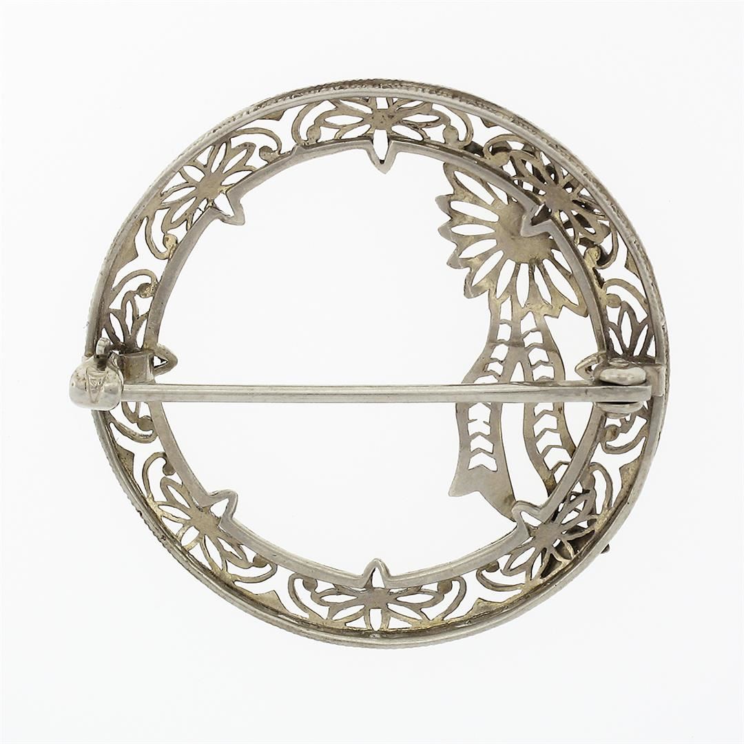 Antique Art Deco 14k White Gold Filigree Circle Wreath Floral Ribbon Brooch Pin