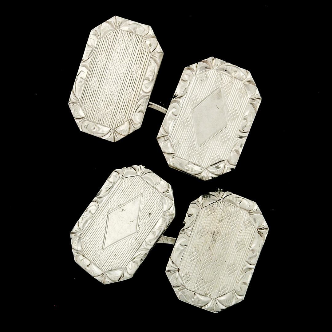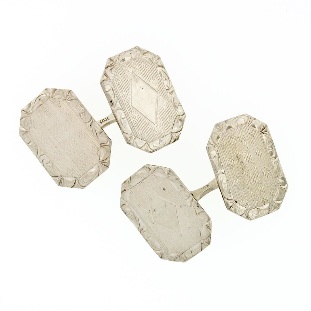 An antique art deco solid 14k white gold hand etched & engraved rectangular cufflinks. These cuff links have a linking bar design with a clearance of 17mm, weigh a total of 6.25 grams, and the front panels measure 17.5x12.2mm.