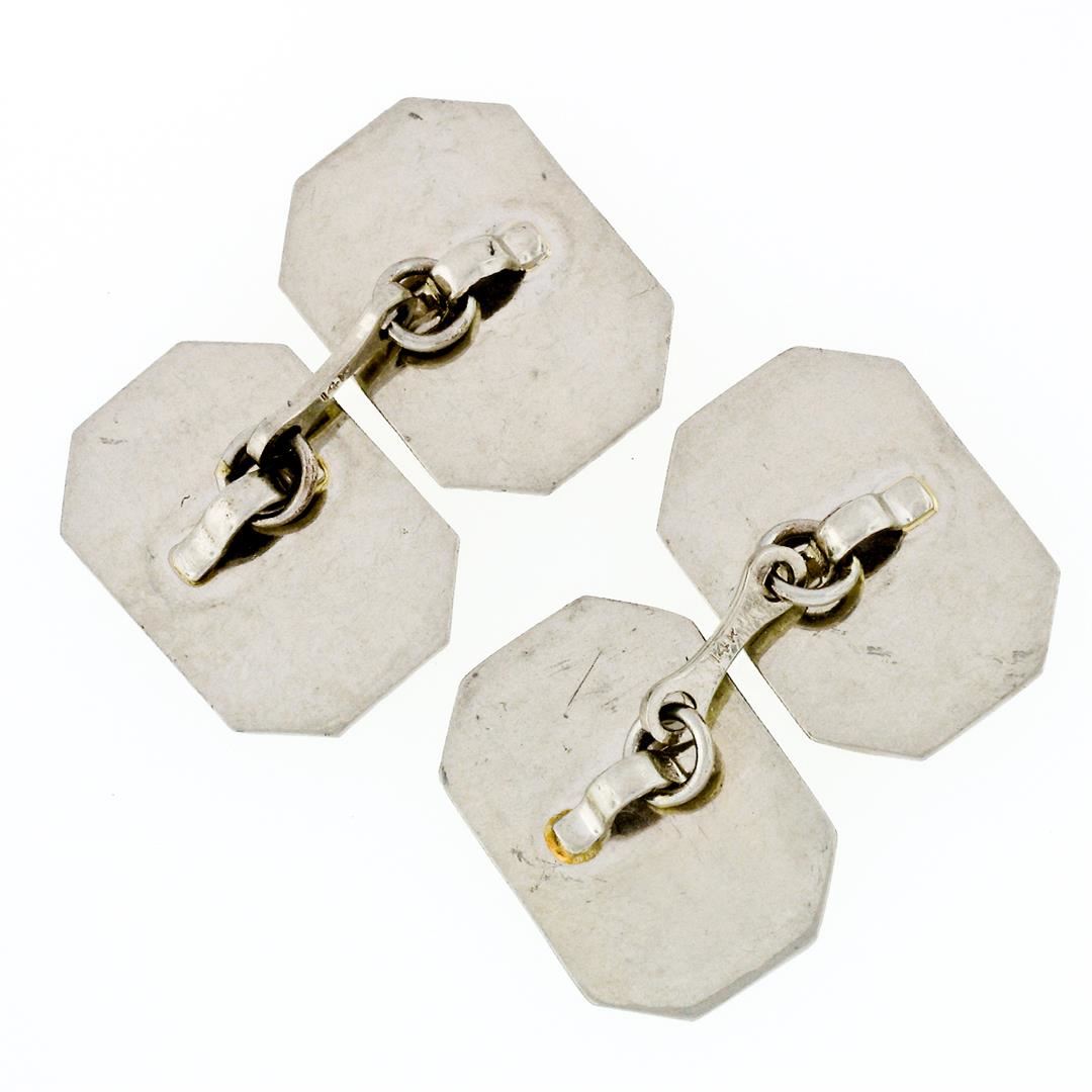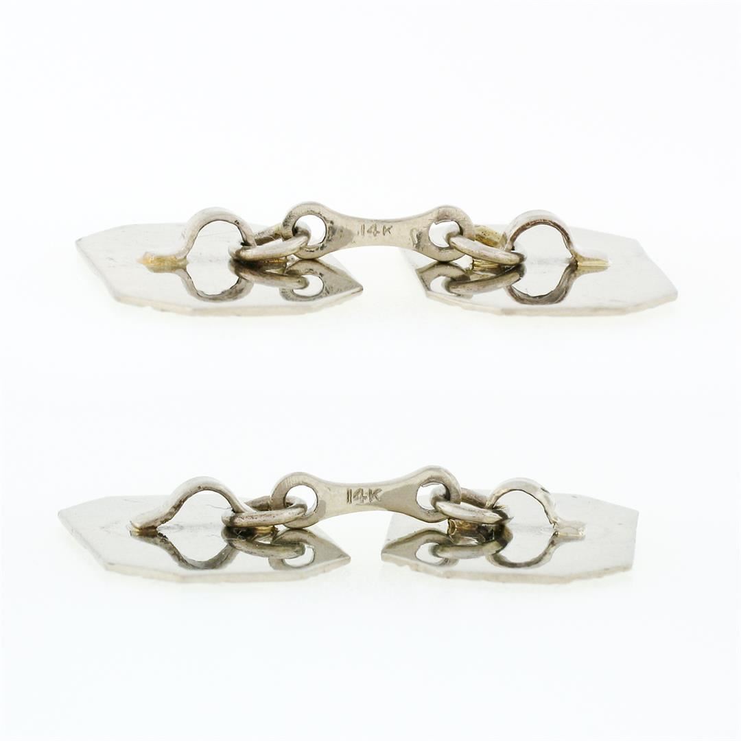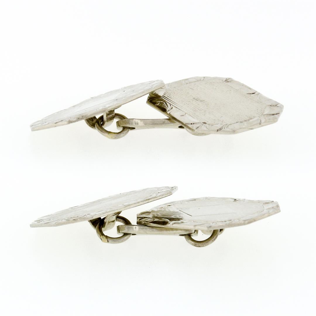 An antique art deco solid 14k white gold hand etched & engraved rectangular cufflinks. These cuff links have a linking bar design with a clearance of 17mm, weigh a total of 6.25 grams, and the front panels measure 17.5x12.2mm.