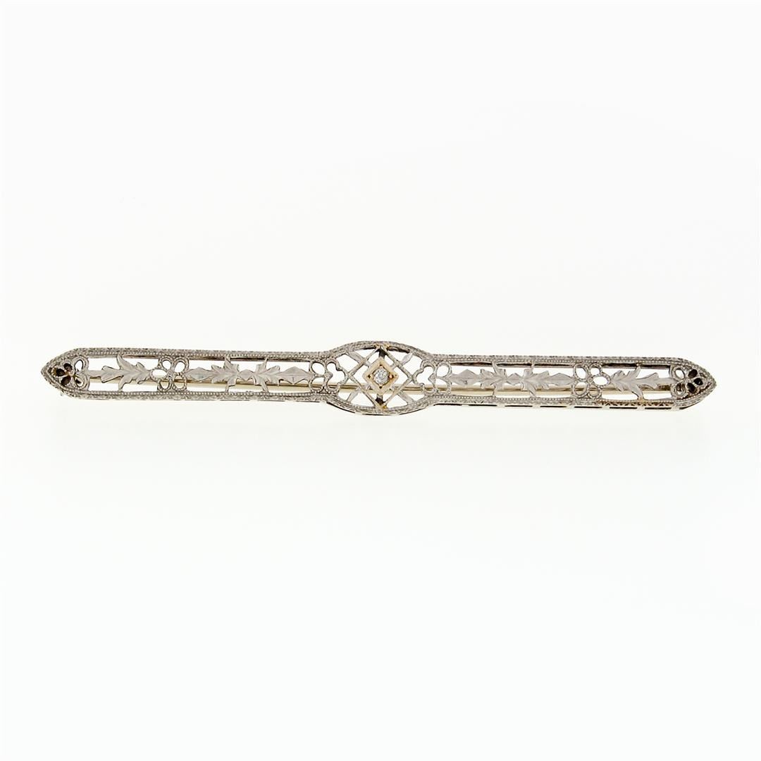 An antique solid 14k whiute gold pin brooch, with 1 old mine cut natural diamond (G- VS2; 0.03ct). Measures 7.02x63.34mm and weighs a total of 3.25 grams.