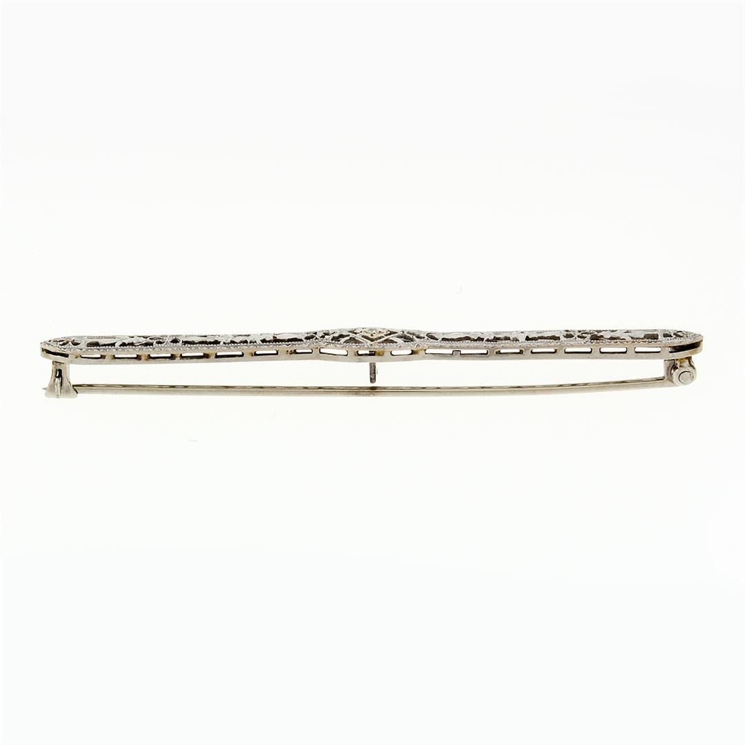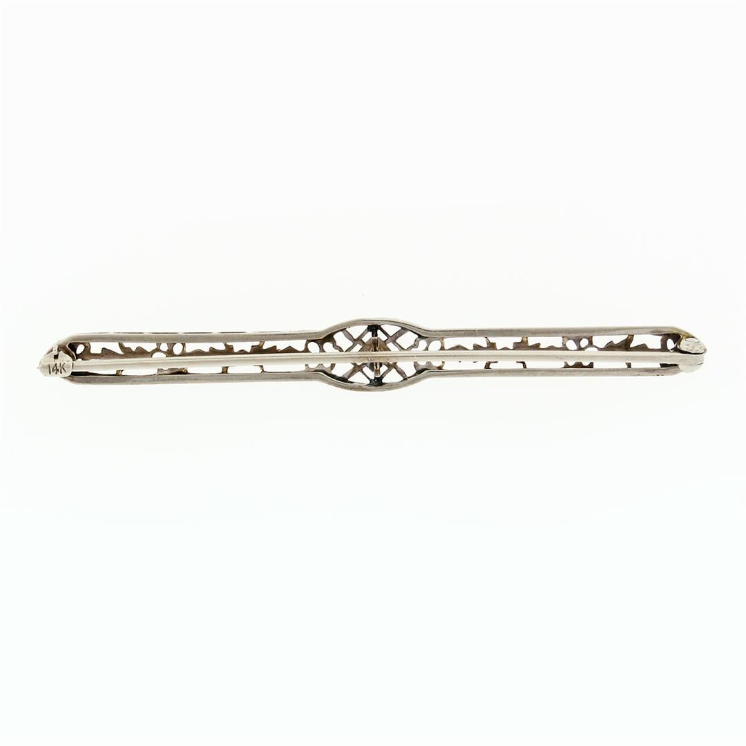 An antique solid 14k whiute gold pin brooch, with 1 old mine cut natural diamond (G- VS2; 0.03ct). Measures 7.02x63.34mm and weighs a total of 3.25 grams.
