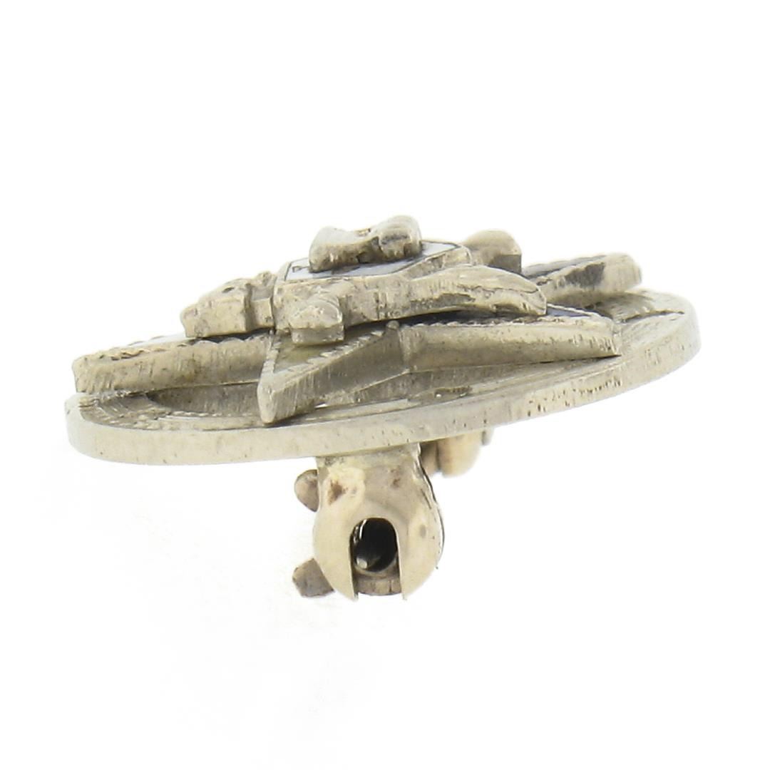 An antique solid 14k white gold masonic brooch, with multi colors enamel work. Measures 11.8mm in diameter and weighs a total of 1.42 grams.