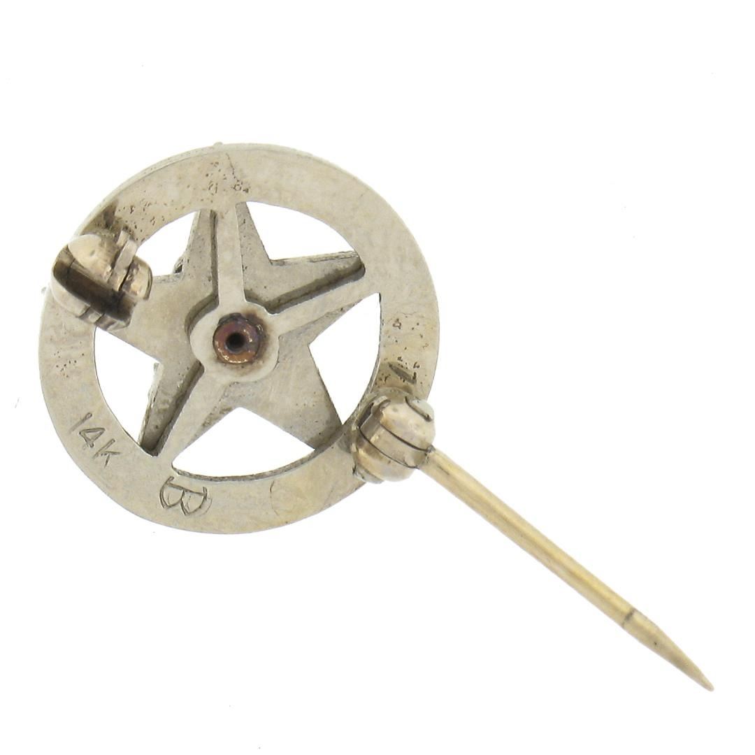 An antique solid 14k white gold masonic brooch, with multi colors enamel work. Measures 11.8mm in diameter and weighs a total of 1.42 grams.