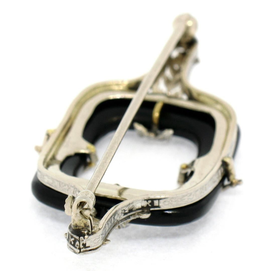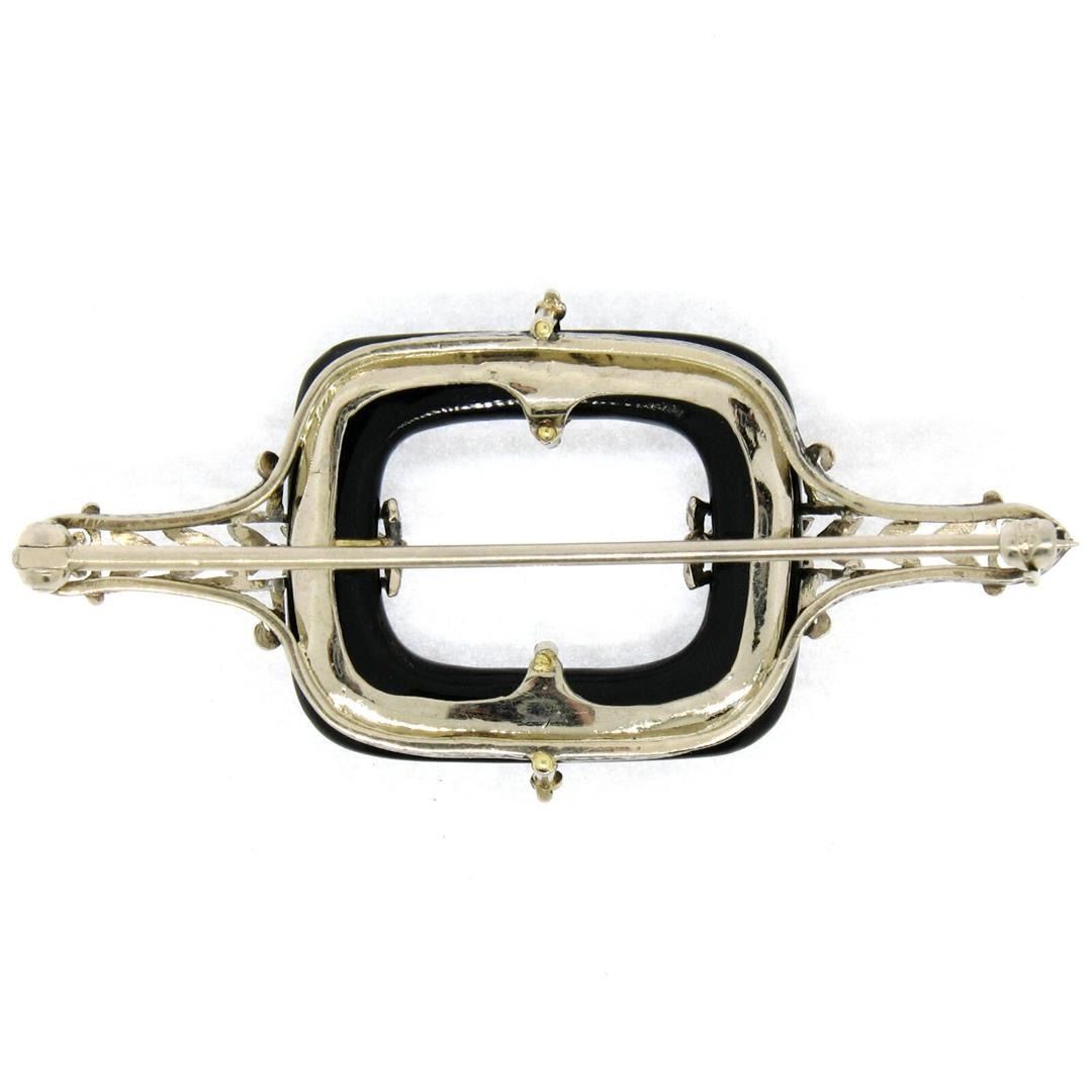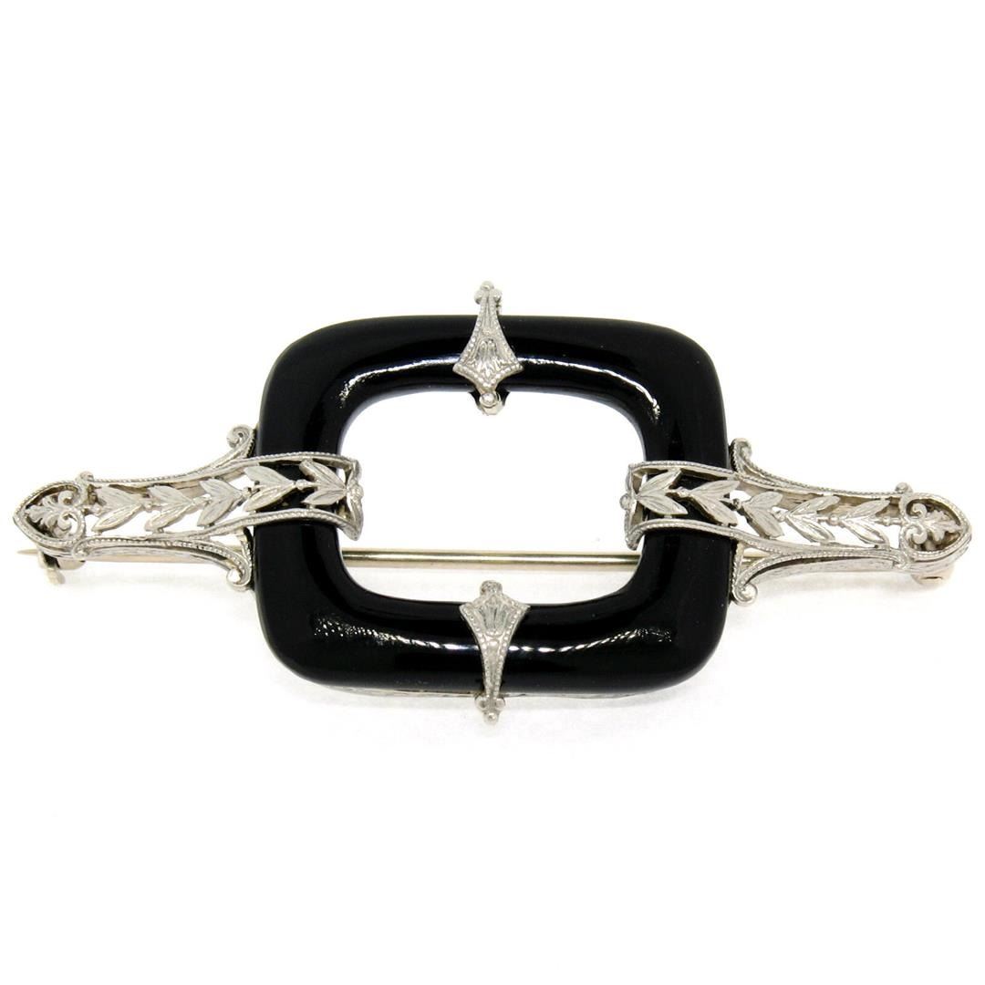 An antiuqe art deco solid 14k white gold scarf pin, with 1 open cushion shape natural black onyx. Measures 24.25x49.40mm and weighs a total of 5.90 grams.