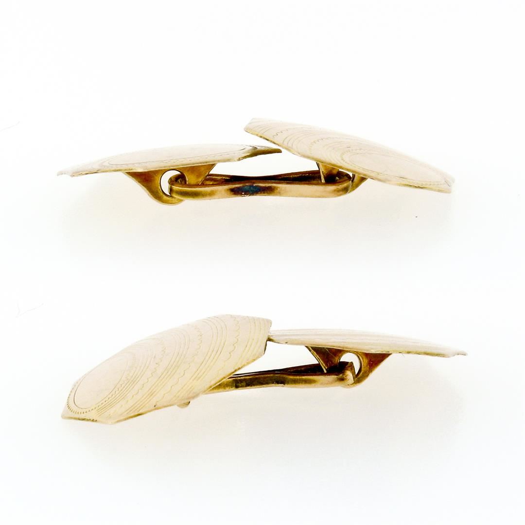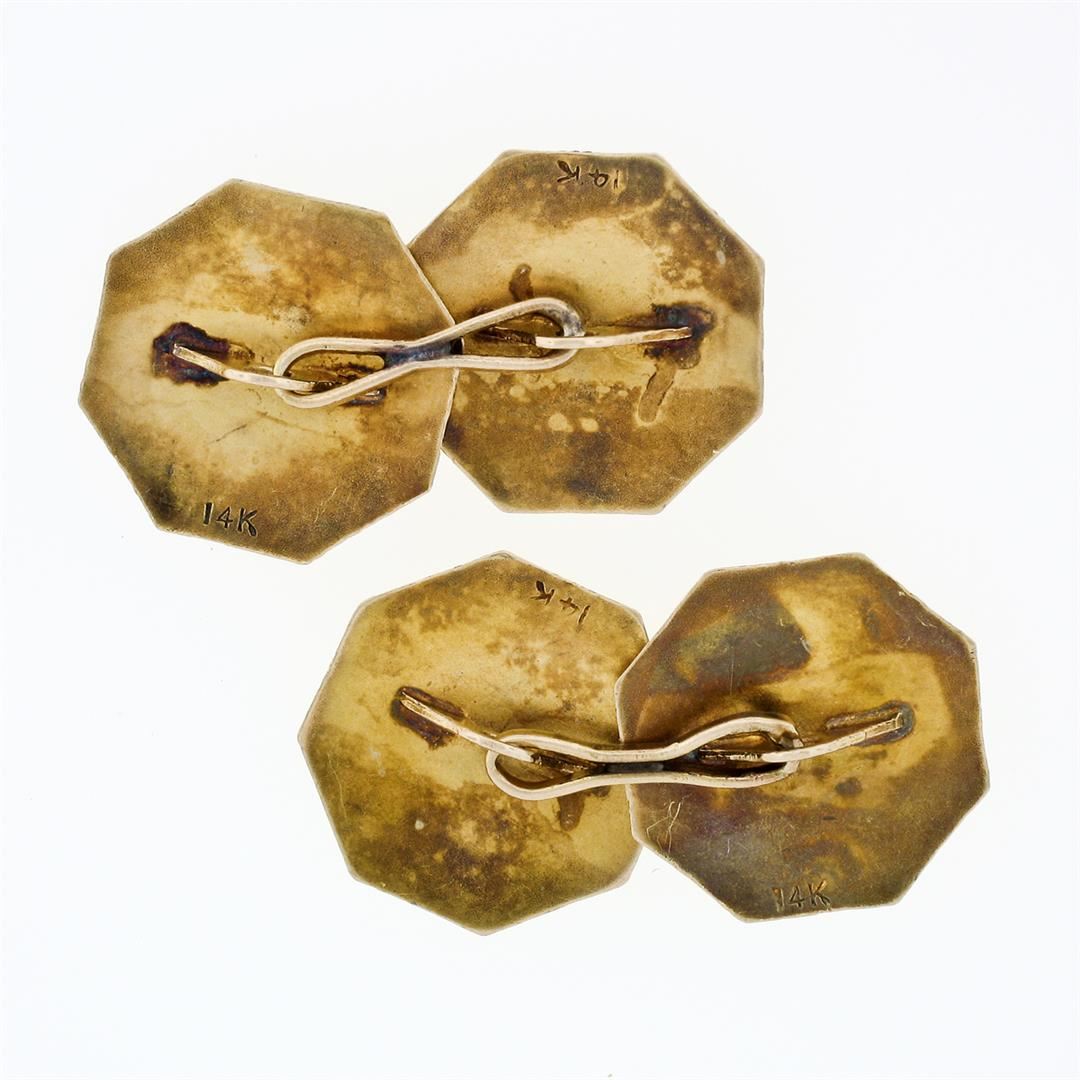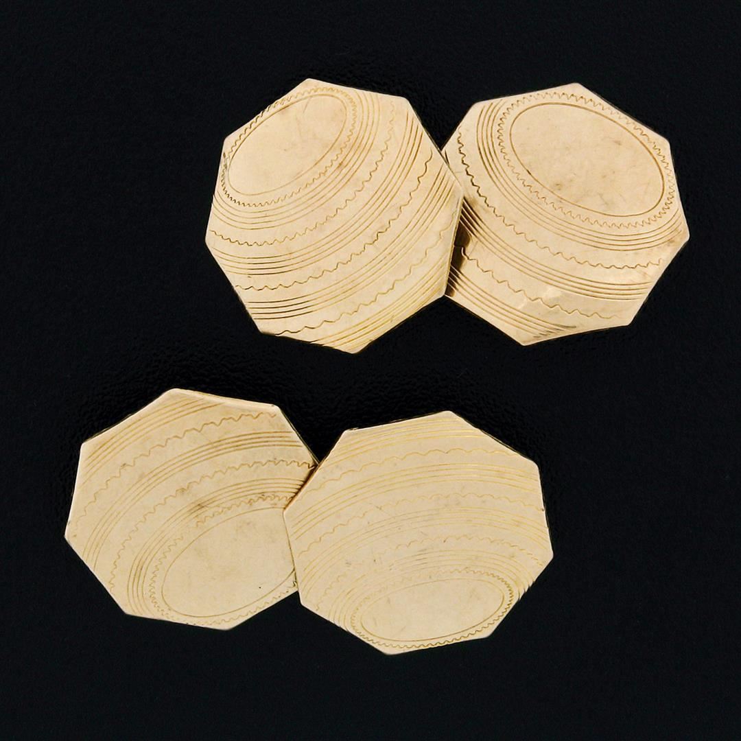 An antique art deco 14k yellow gold octagonal cufflinks. These cuff links have a linking bar design with a clearance of 17.2mm, weigh a total of 3.66 grams, and the front panels measure 14.7x15.9mm.