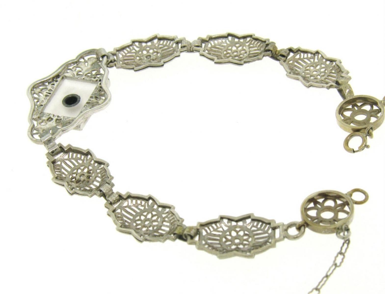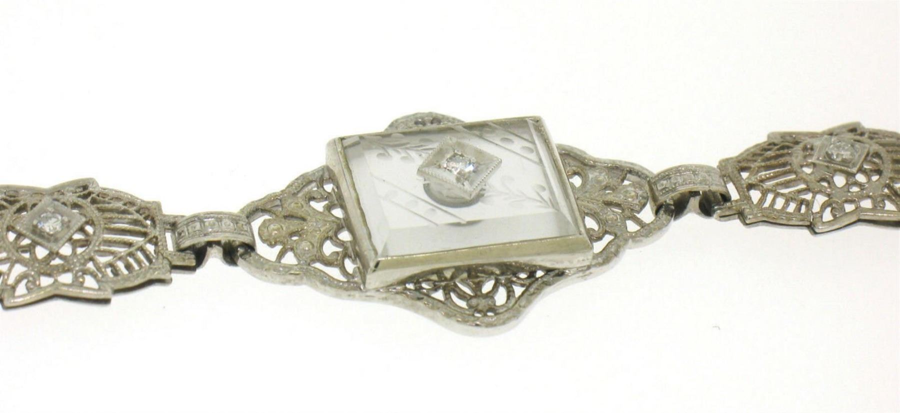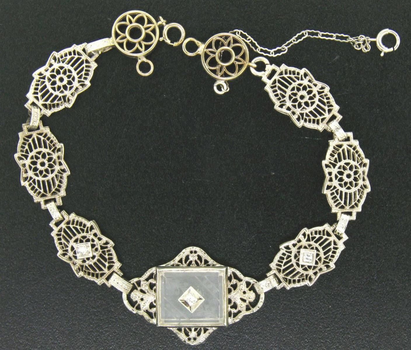 An antique art deco period 14kt white gold filigree bracelet featuring a piece of square camphor glass accented by 3 round single cut diamonds (G - VS2). It weighs a total of 8.50 grams, measures 18.40mm wide, and measures 6.5 inches in length.