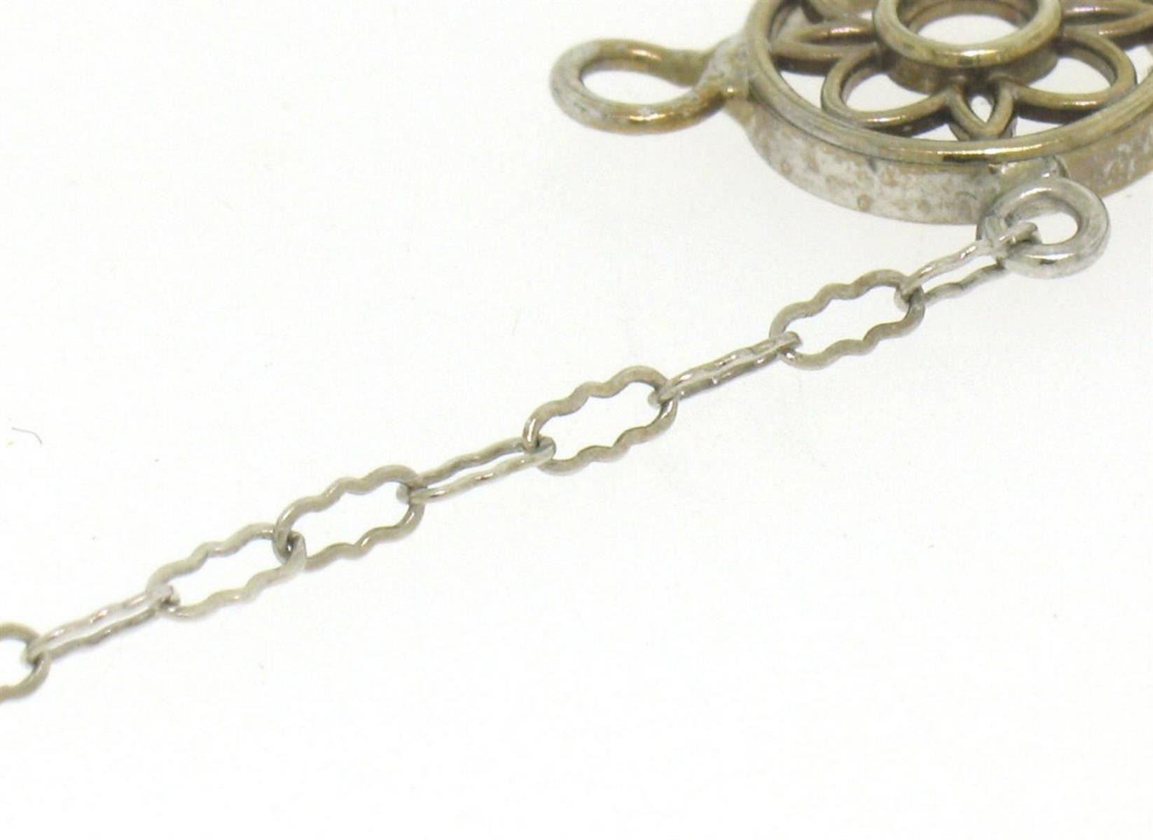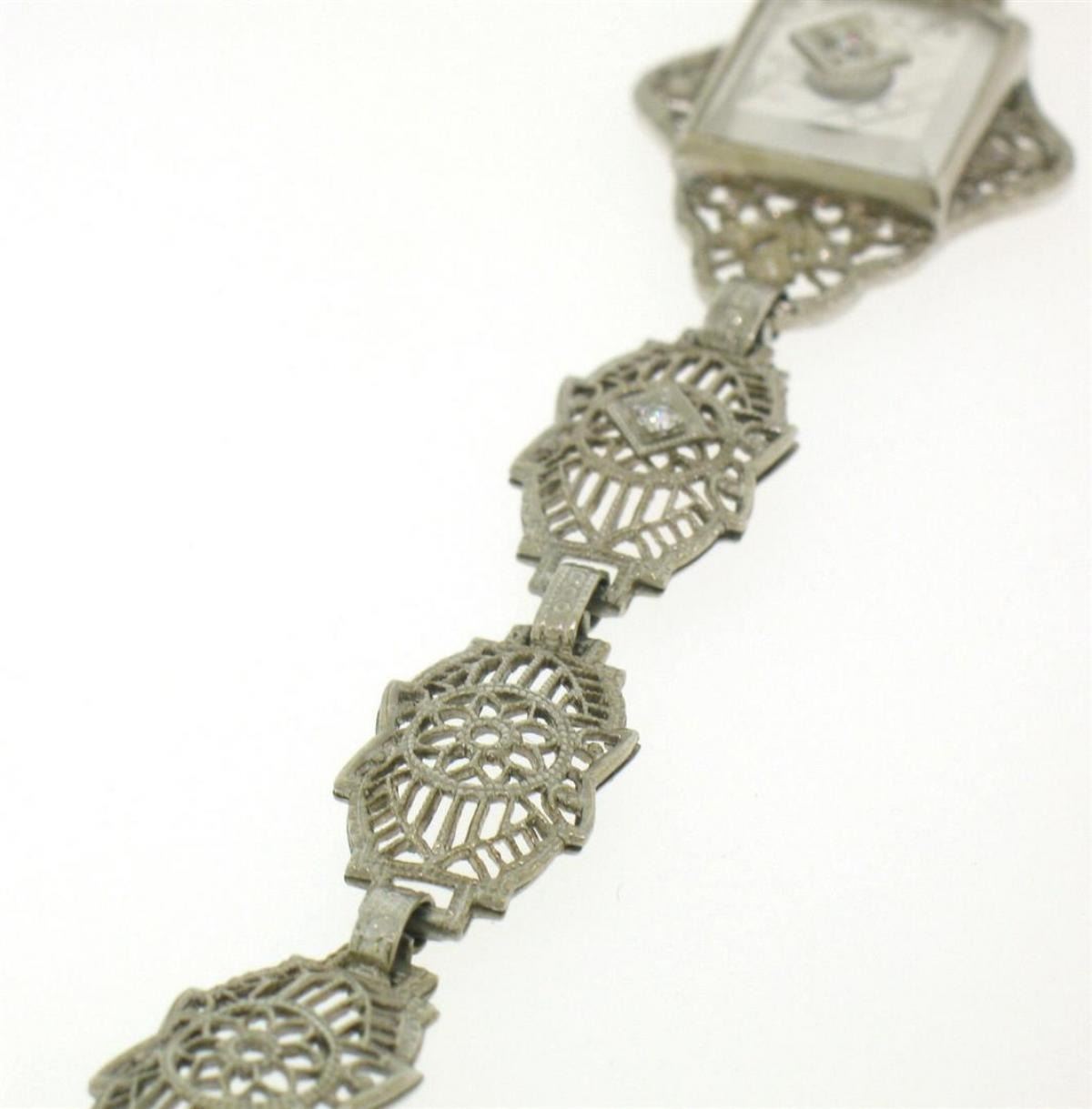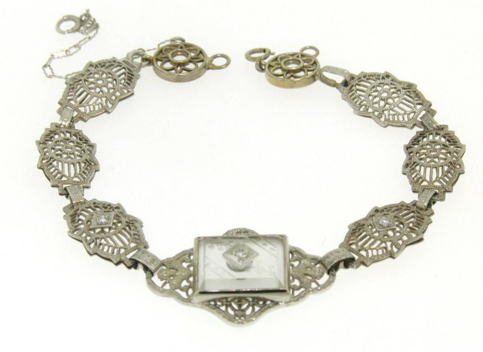 An antique art deco period 14kt white gold filigree bracelet featuring a piece of square camphor glass accented by 3 round single cut diamonds (G - VS2). It weighs a total of 8.50 grams, measures 18.40mm wide, and measures 6.5 inches in length.