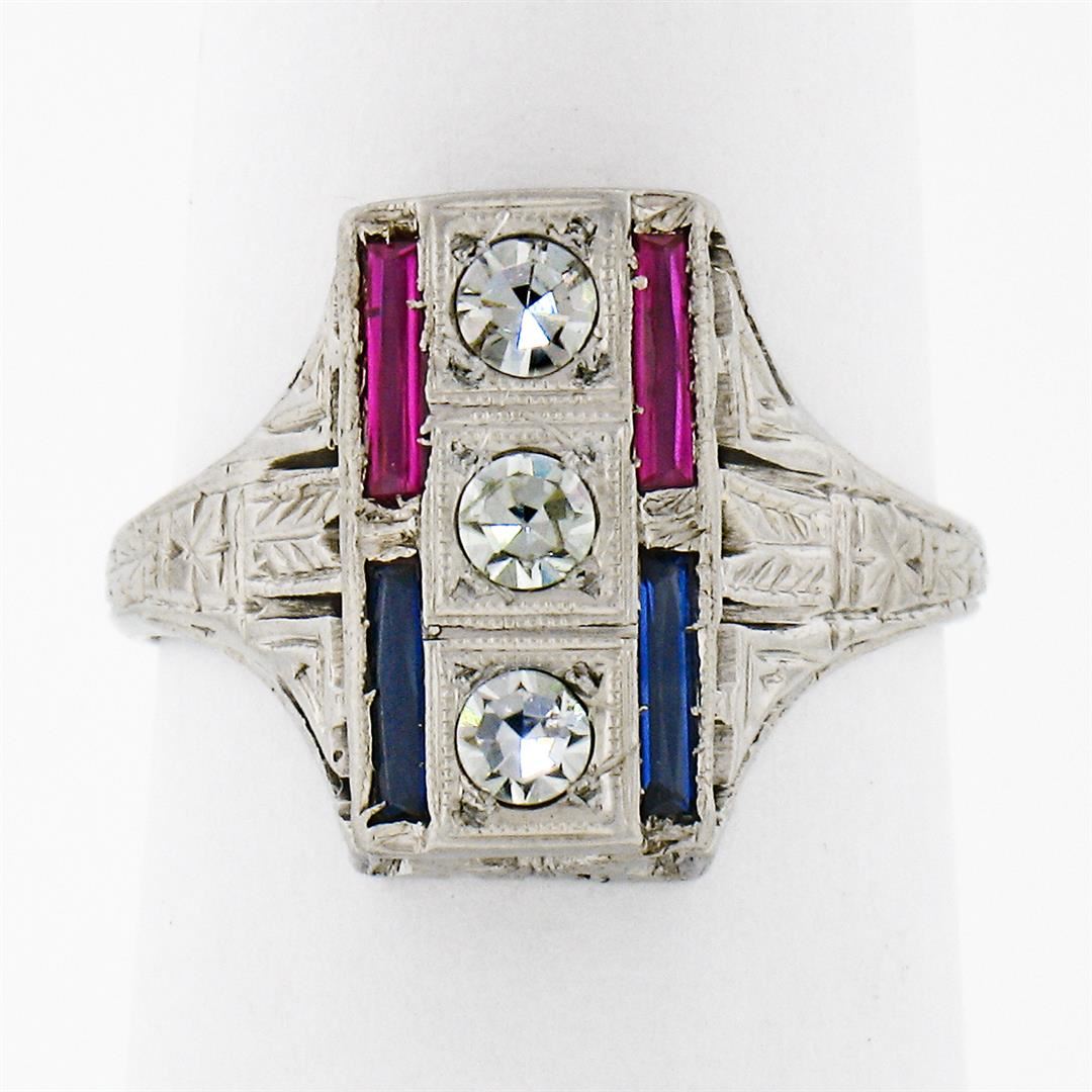 An antique solid 18k white gold dinner ring, with 3 singke cut natural diamonds (F - VS1; 0.24ctw). 2 french baguette cut natural rubies, and 2 french baguette cut natural sapphires. The ring is size 6.0, weighs a total of 3.21 grams, and measures 6.85mm wide.