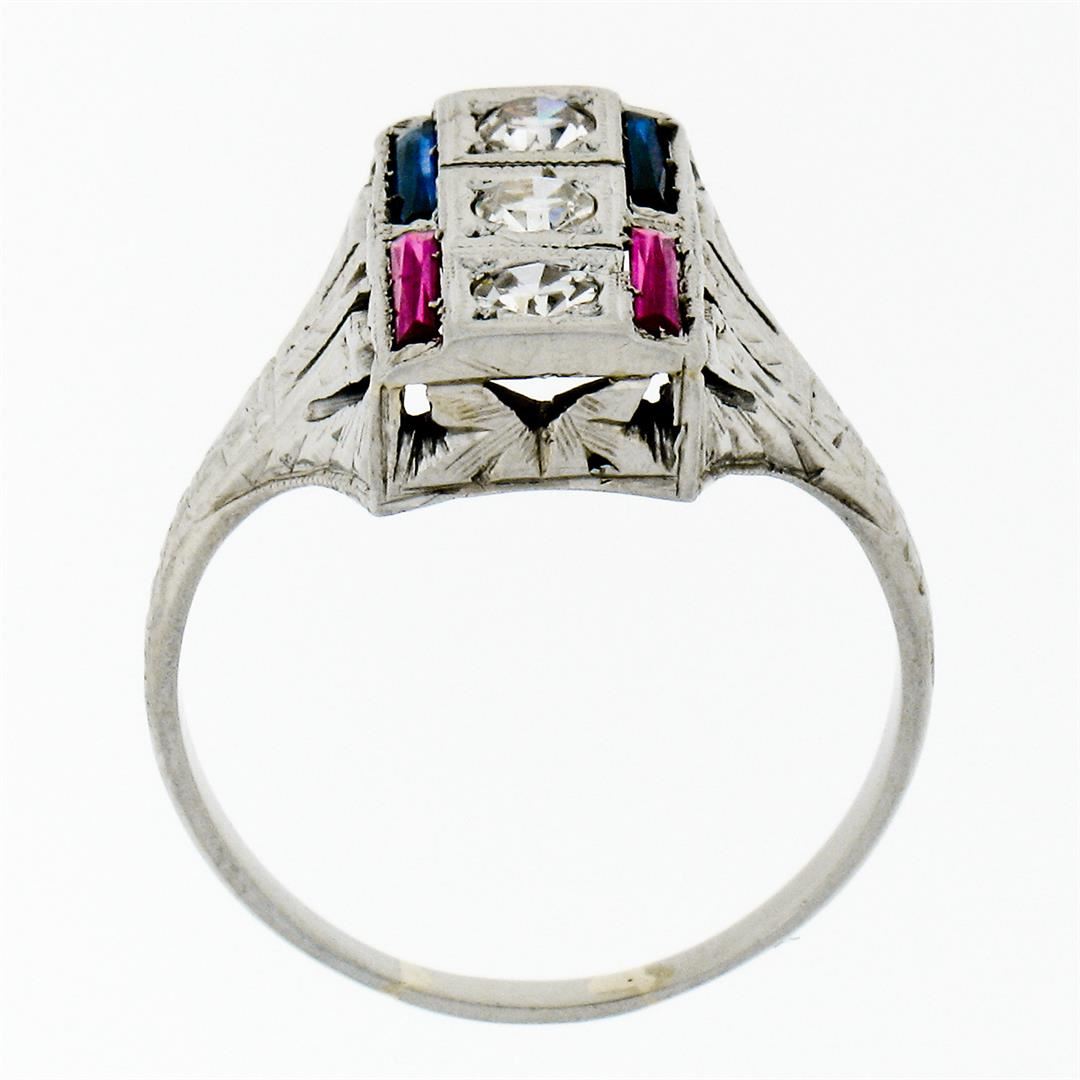 An antique solid 18k white gold dinner ring, with 3 singke cut natural diamonds (F - VS1; 0.24ctw). 2 french baguette cut natural rubies, and 2 french baguette cut natural sapphires. The ring is size 6.0, weighs a total of 3.21 grams, and measures 6.85mm wide.