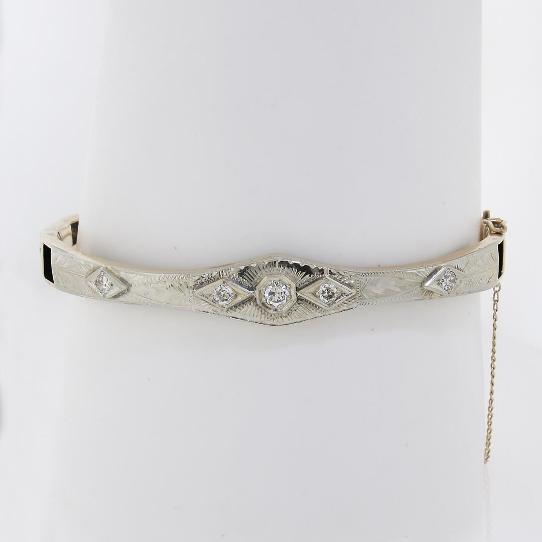 An antique solid 18k yellow & white gold higed bangle bracelet. featuring 5 old european cut natural diamonds (G-I - VS1/VS2 ; 0.37ctw). It weighs a total of 12.15 grams, measures 19.3mm wide, and measures 7 inches in length.