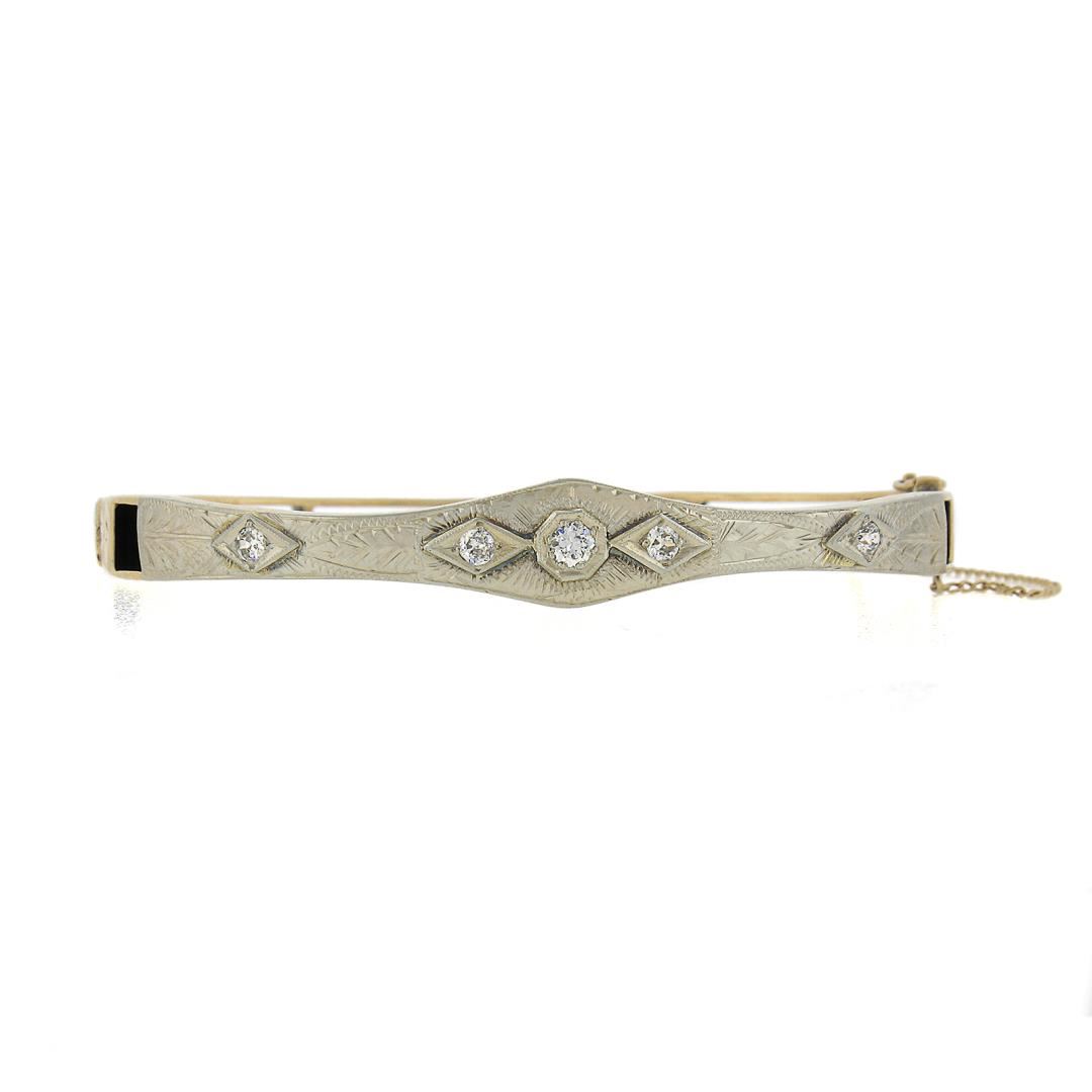 An antique solid 18k yellow & white gold higed bangle bracelet. featuring 5 old european cut natural diamonds (G-I - VS1/VS2 ; 0.37ctw). It weighs a total of 12.15 grams, measures 19.3mm wide, and measures 7 inches in length.