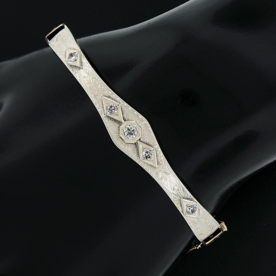 An antique solid 18k yellow & white gold higed bangle bracelet. featuring 5 old european cut natural diamonds (G-I - VS1/VS2 ; 0.37ctw). It weighs a total of 12.15 grams, measures 19.3mm wide, and measures 7 inches in length.