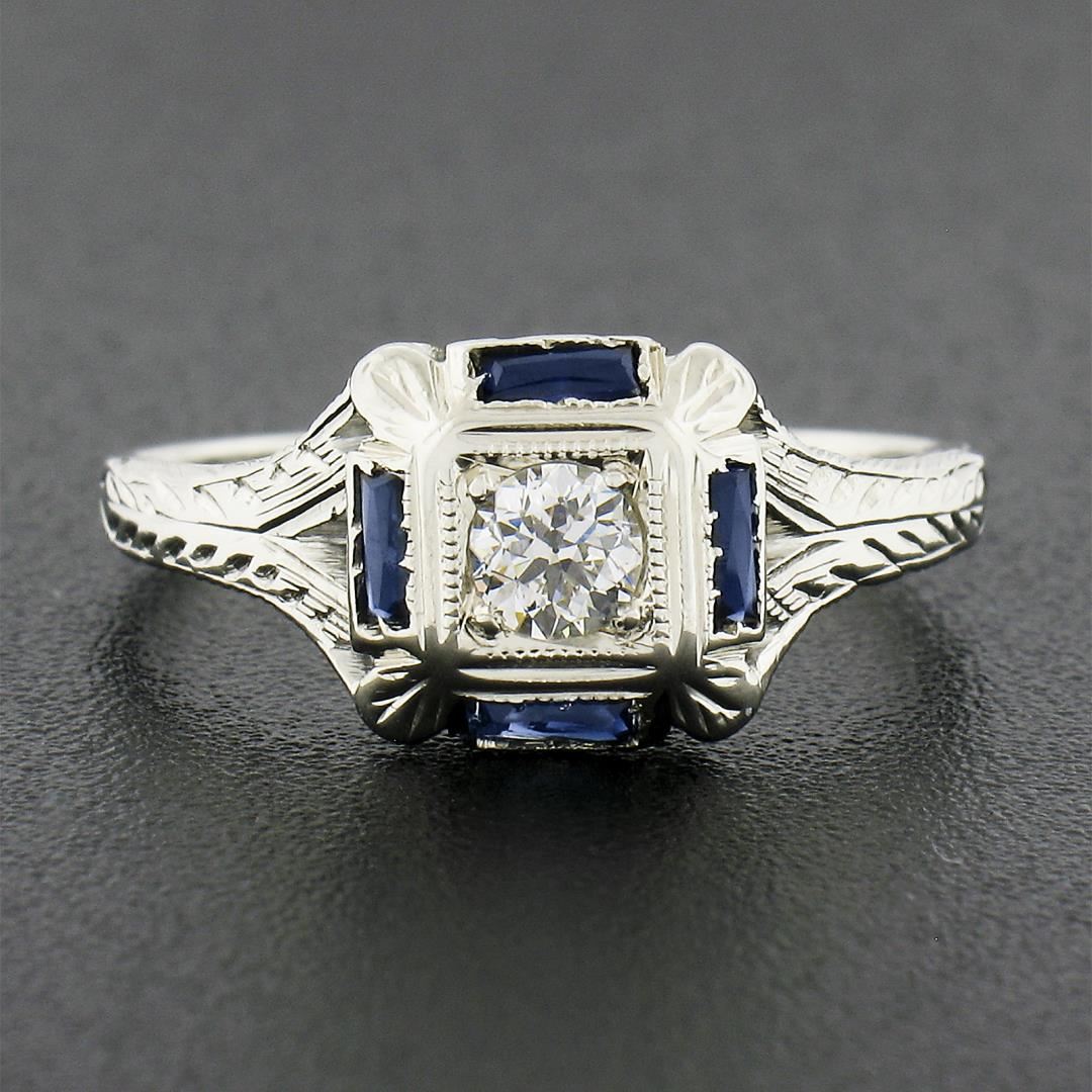 An antique solid 18k white gold ring, with 1 old European cut natural diamond (G - VS1 ;- 0.15ct), and 4 French baguette cut synthetic sapphires (3.3x1.2mm each ). The ring is size 5.0, weighs a total of 2.02 grams, and measures 8mm wide.