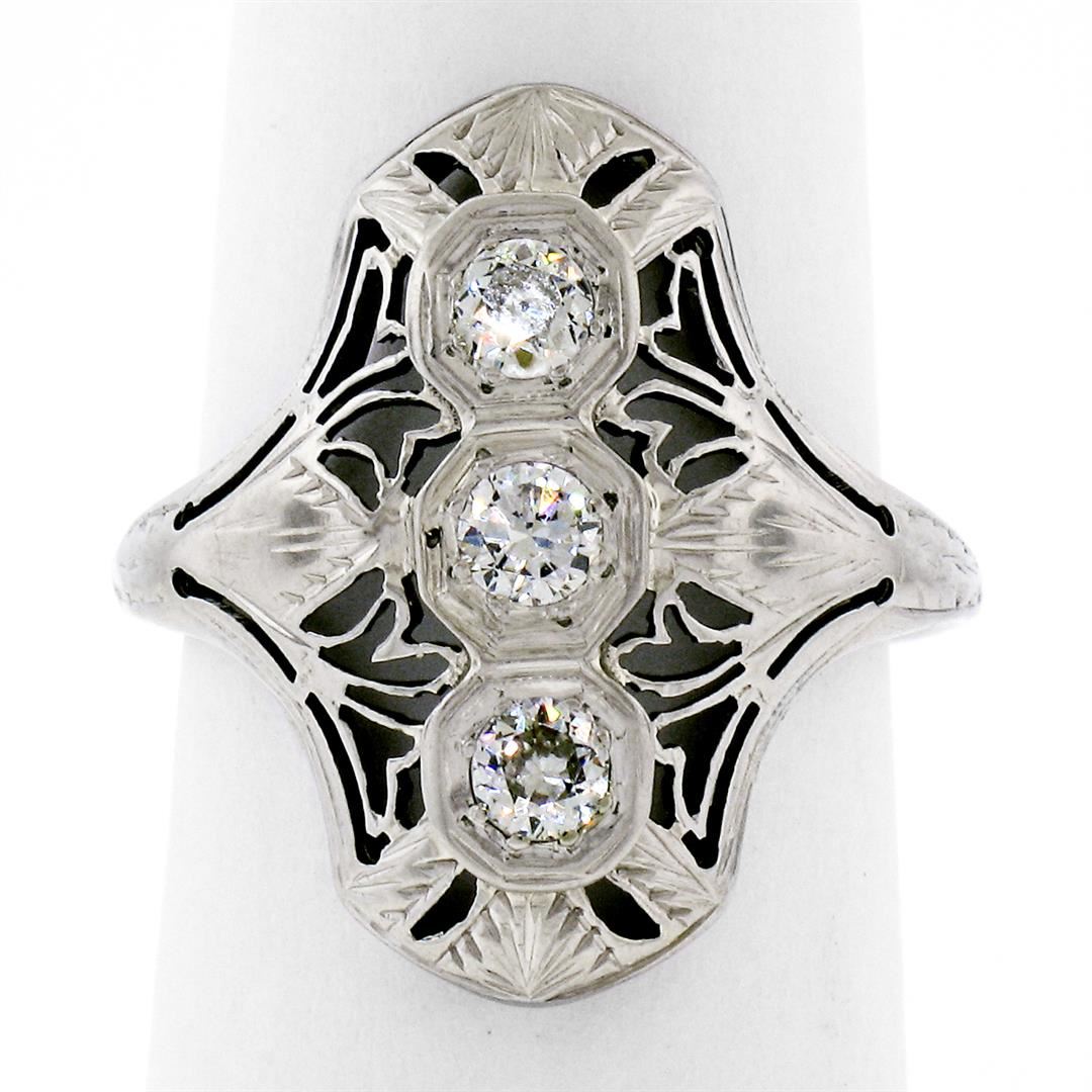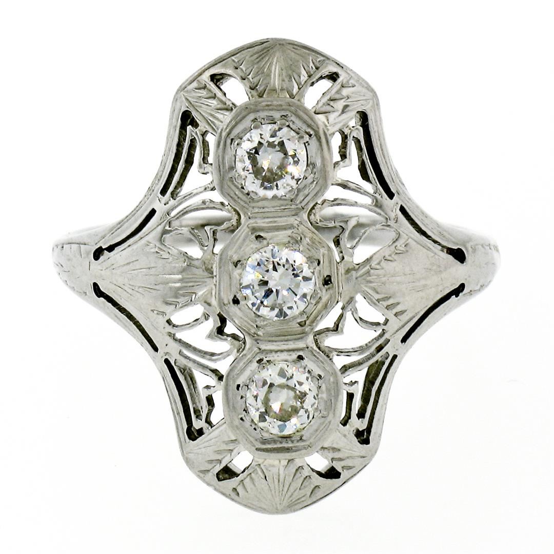 An antique solid 18k white gold filigree dinner ring, with 3 old european cut natural diamonds (G/H- VS2/SI1; 0.35ctw). The ring is size 6.0, weighs a total of 3.28 grams, and measures 20.50mm wide.