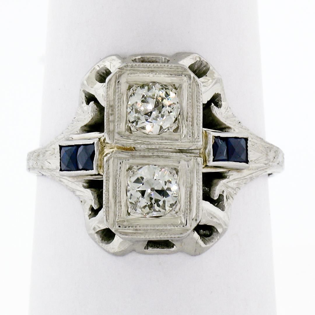 Antique Art Deco 18K White Gold .46ctw Diamond Sapphire Open Etched Dinner Ring