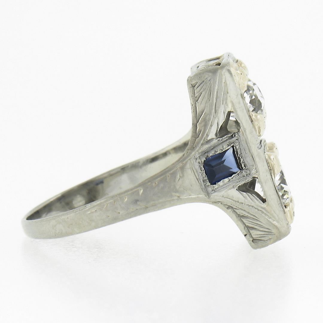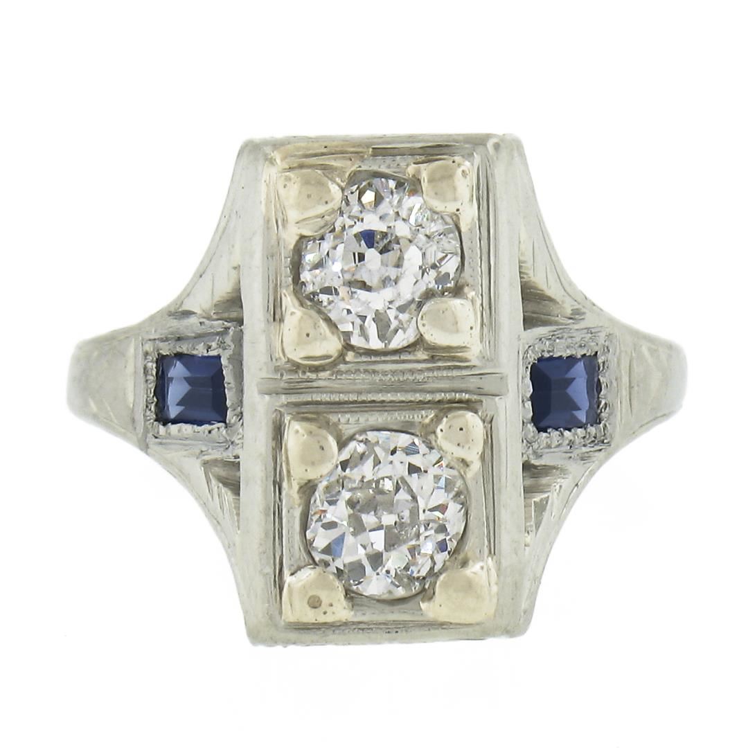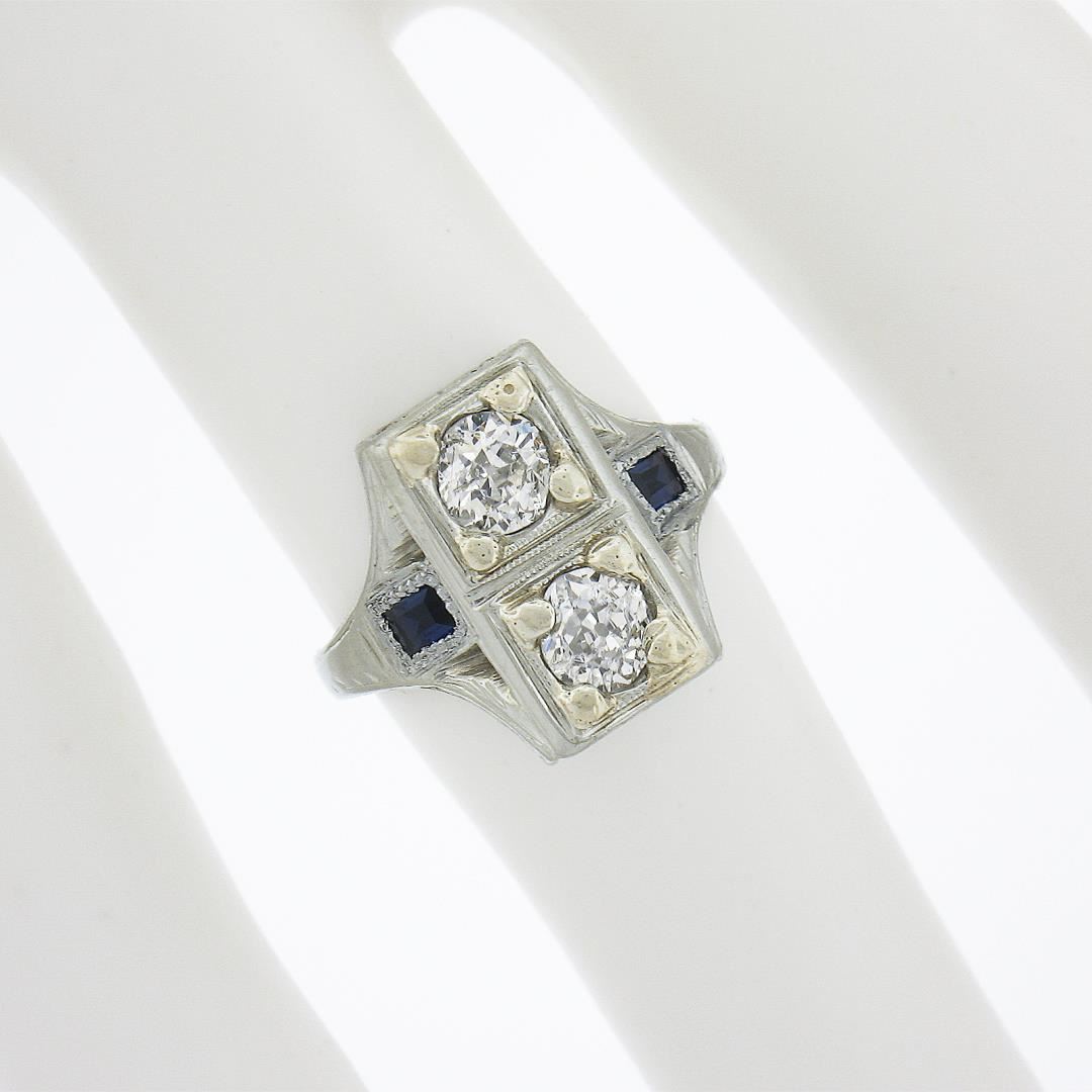 An antique solid 18k white gold ring, with 2 old european cut natural diamonds (G/H - SI1-I1 ; 0.55ctw), and 2 baguette cut synthetic sapphires . The ring is size 4.25, weighs a total of 3.21 grams, and measures 13.3mm wide.