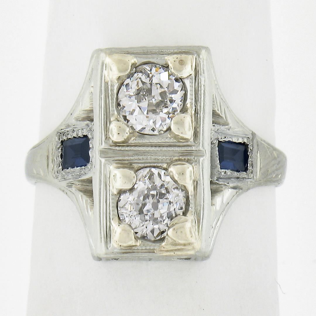 An antique solid 18k white gold ring, with 2 old european cut natural diamonds (G/H - SI1-I1 ; 0.55ctw), and 2 baguette cut synthetic sapphires . The ring is size 4.25, weighs a total of 3.21 grams, and measures 13.3mm wide.
