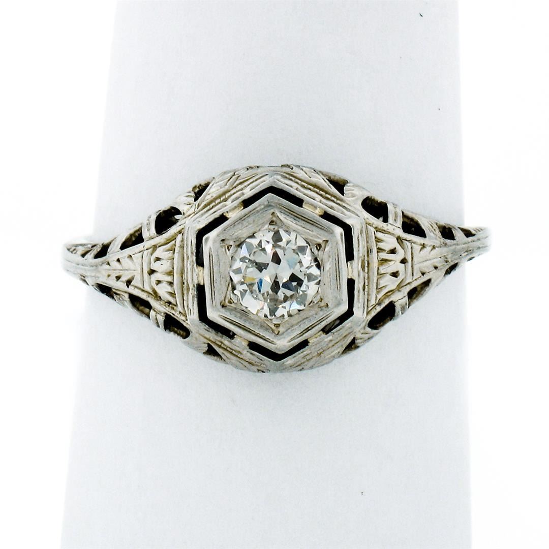 An antique solid 18k white gold filigree ring, with 1 old european cut natural diamond (G- VS1; 0.26ctw). The ring is size 8.0, weighs a total of 2.4 grams, and measures 9.60mm wide.