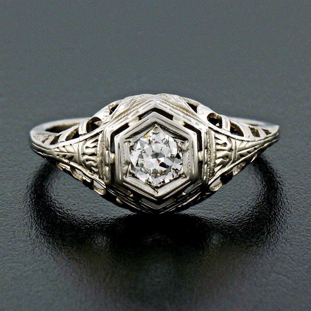 An antique solid 18k white gold filigree ring, with 1 old european cut natural diamond (G- VS1; 0.26ctw). The ring is size 8.0, weighs a total of 2.4 grams, and measures 9.60mm wide.
