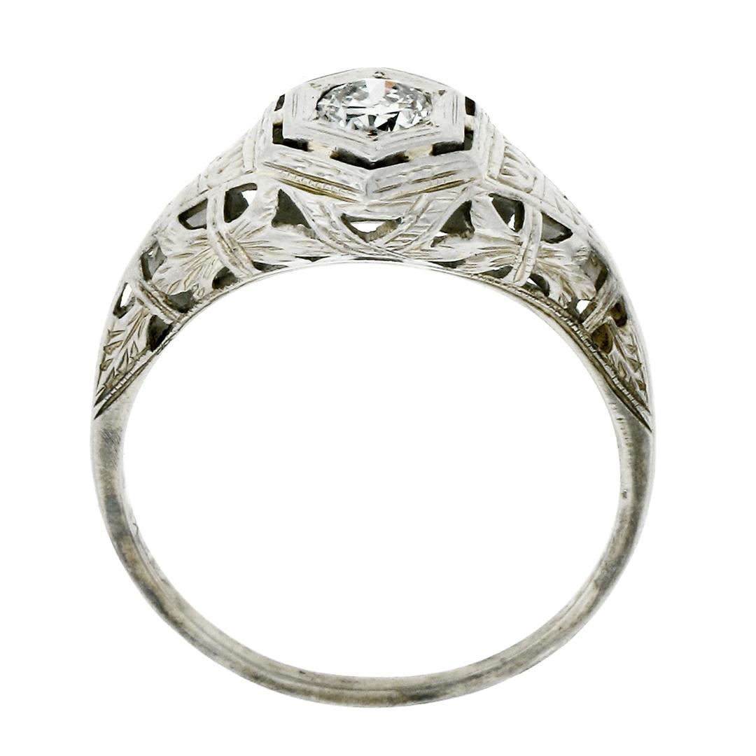 An antique solid 18k white gold filigree ring, with 1 old european cut natural diamond (G- VS1; 0.26ctw). The ring is size 8.0, weighs a total of 2.4 grams, and measures 9.60mm wide.