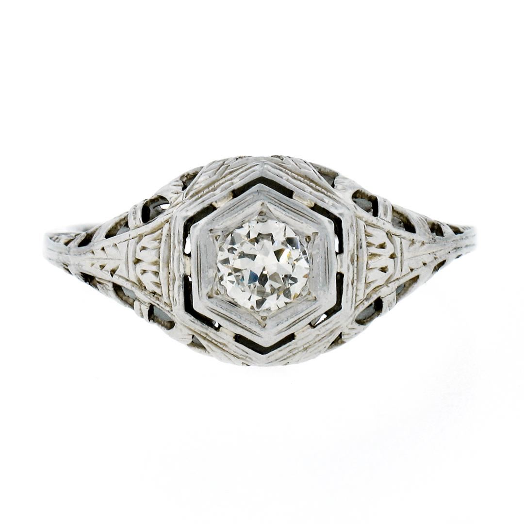 An antique solid 18k white gold filigree ring, with 1 old european cut natural diamond (G- VS1; 0.26ctw). The ring is size 8.0, weighs a total of 2.4 grams, and measures 9.60mm wide.