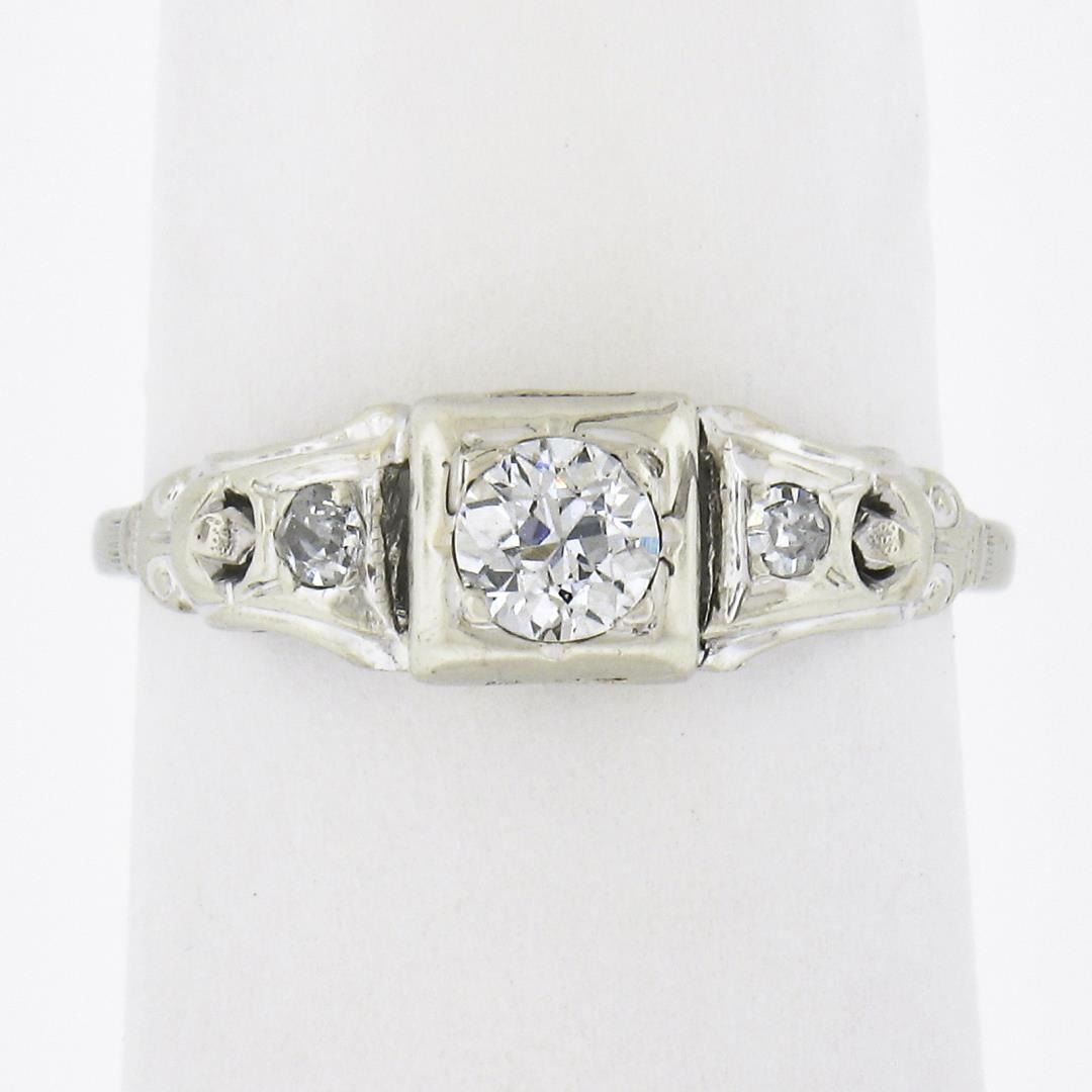 An antique solid 18k white gold 3 stones ring, with 1 old european cut natural diamond (G/H - SI1 ; 0.26ct), and 2 old single cut natural diamonds ( G/H - SI2-I2 ; 0.03ctw ). The ring is size 4.75, weighs a total of 1.51 grams, and measures 5.6mm wide.