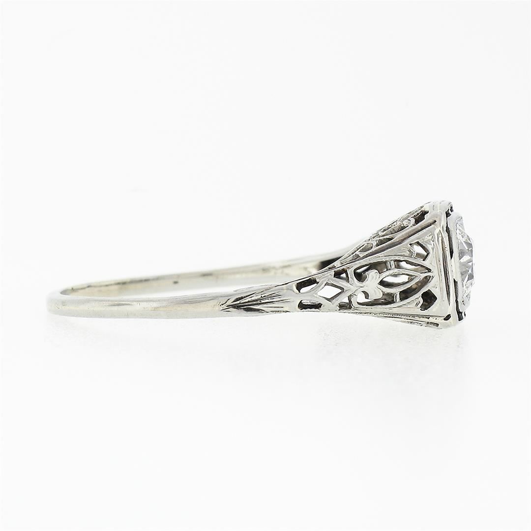 An antique art deco solid 18k white gold engagement ring, featuring 1 old european cut natural diamond (G - VS2 ; 0.38ct). The ring is size 8.0, weighs a total of 2 grams, and measures 7.45mm wide.