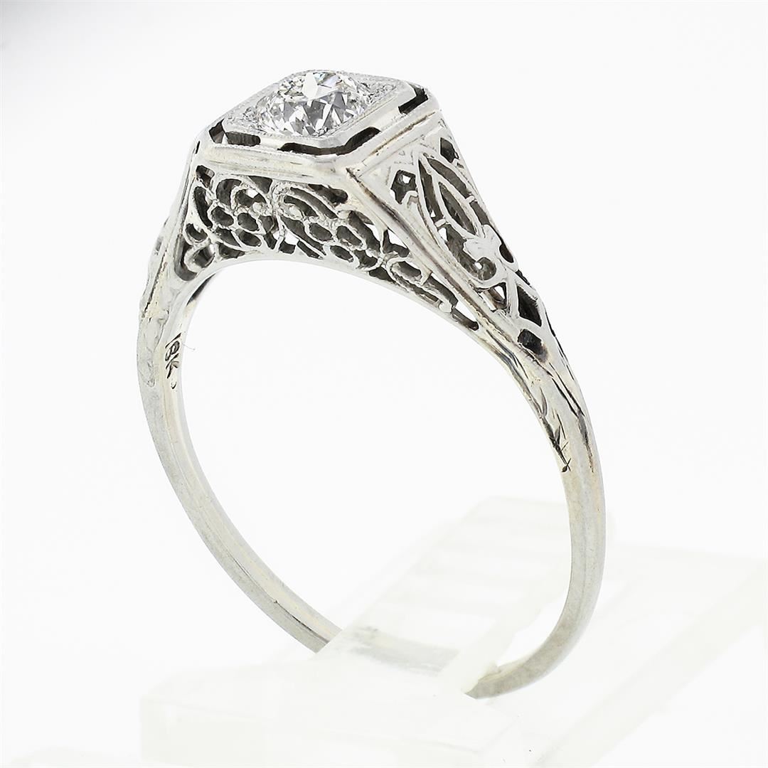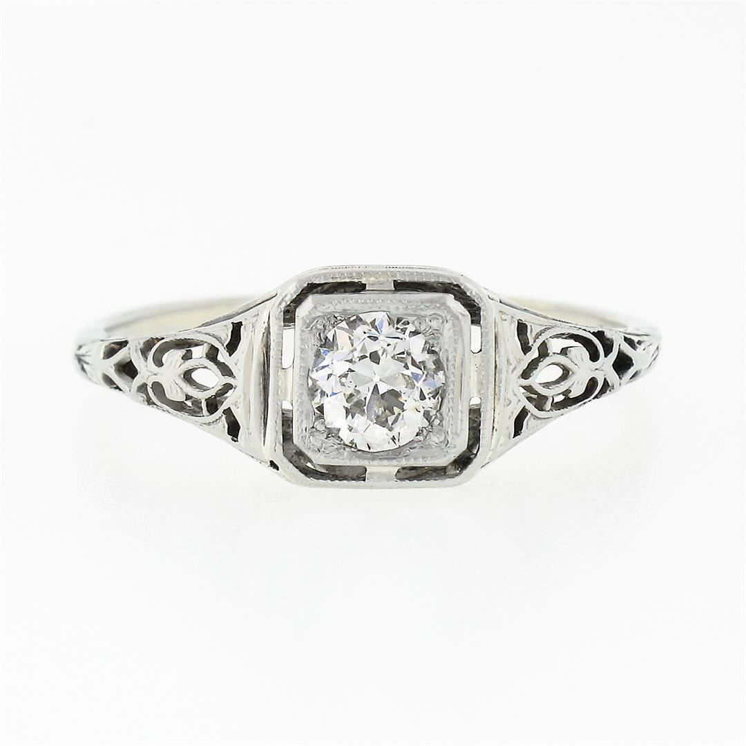 An antique art deco solid 18k white gold engagement ring, featuring 1 old european cut natural diamond (G - VS2 ; 0.38ct). The ring is size 8.0, weighs a total of 2 grams, and measures 7.45mm wide.