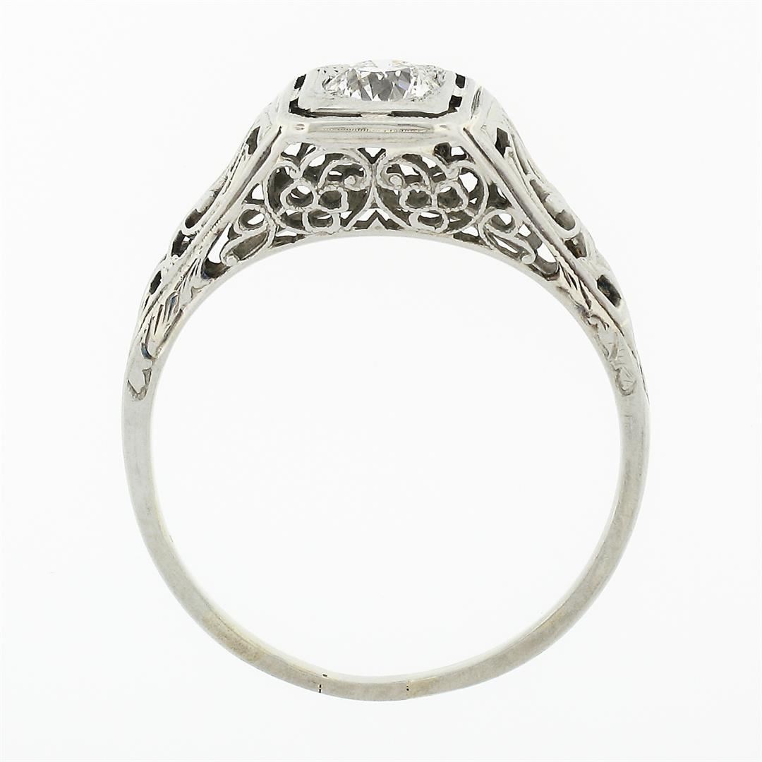 An antique art deco solid 18k white gold engagement ring, featuring 1 old european cut natural diamond (G - VS2 ; 0.38ct). The ring is size 8.0, weighs a total of 2 grams, and measures 7.45mm wide.