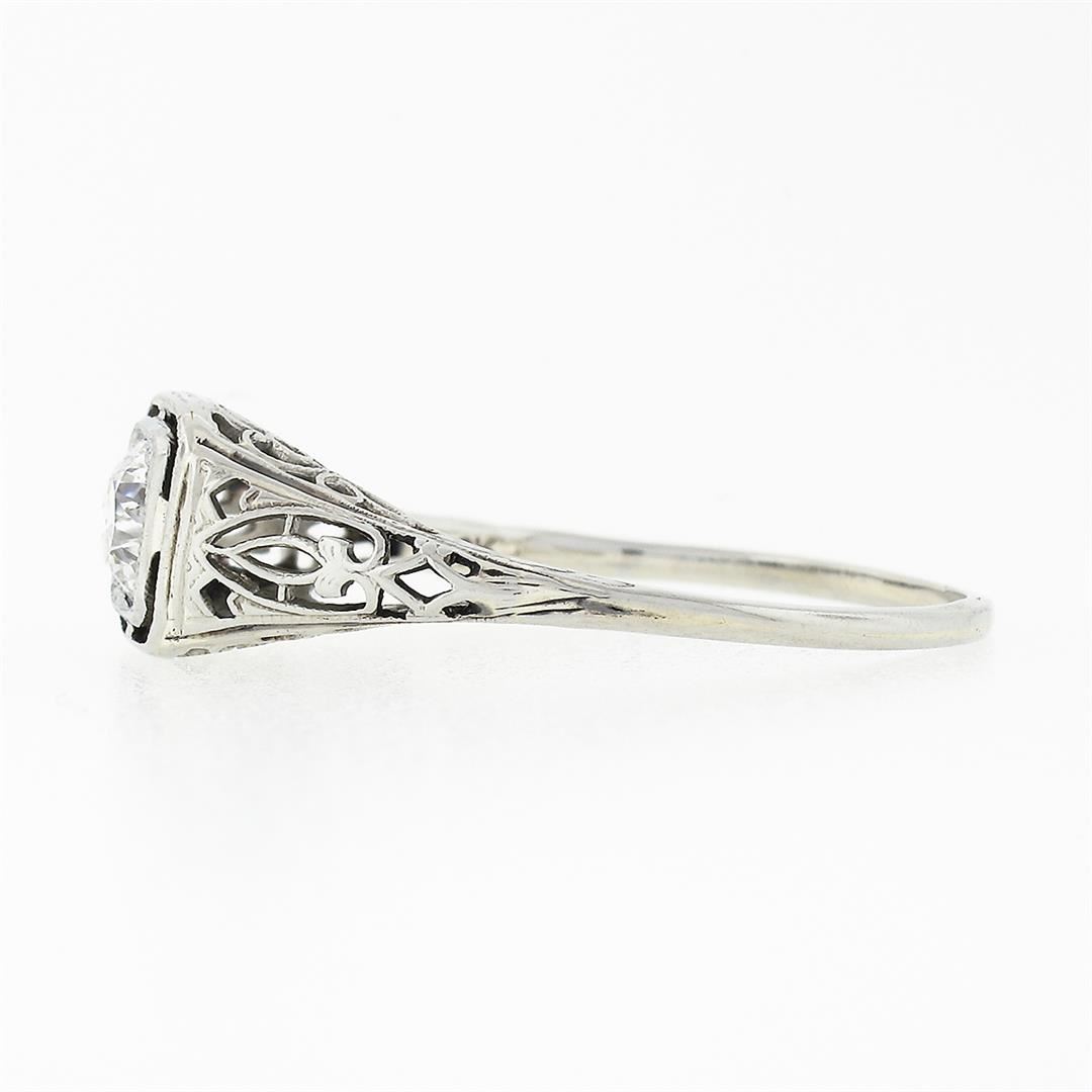 An antique art deco solid 18k white gold engagement ring, featuring 1 old european cut natural diamond (G - VS2 ; 0.38ct). The ring is size 8.0, weighs a total of 2 grams, and measures 7.45mm wide.