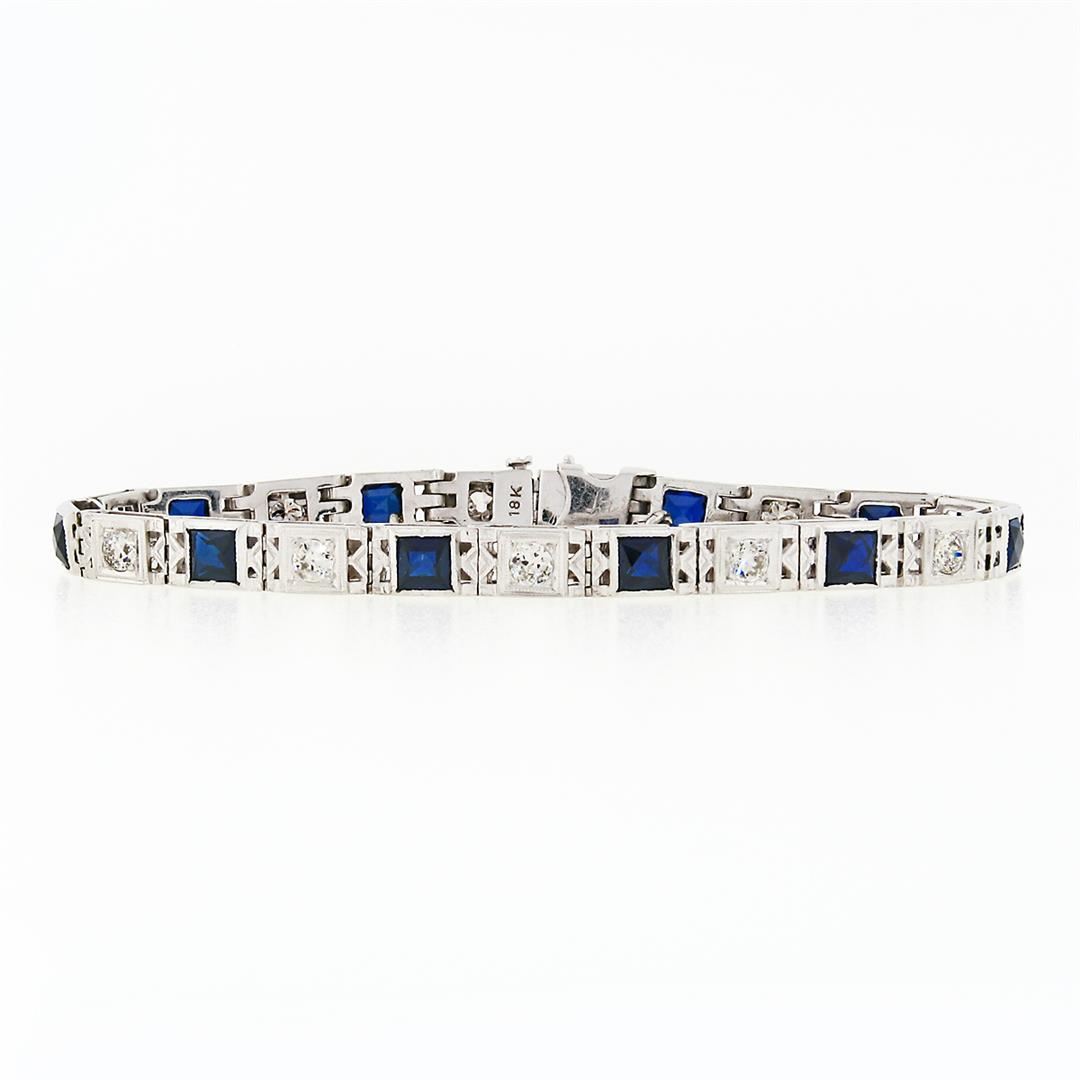 An art deco period solid 18k white gold line bracelet, with 10 old European cut natural diamonds (G/H - VS1/VS2; 1.10ctw), and 10 square french cut synthetic sapphire (3.5mm). It weighs a total of 12.77 grams, measures 4.85mm wide, and measures 5.75 inches in length.