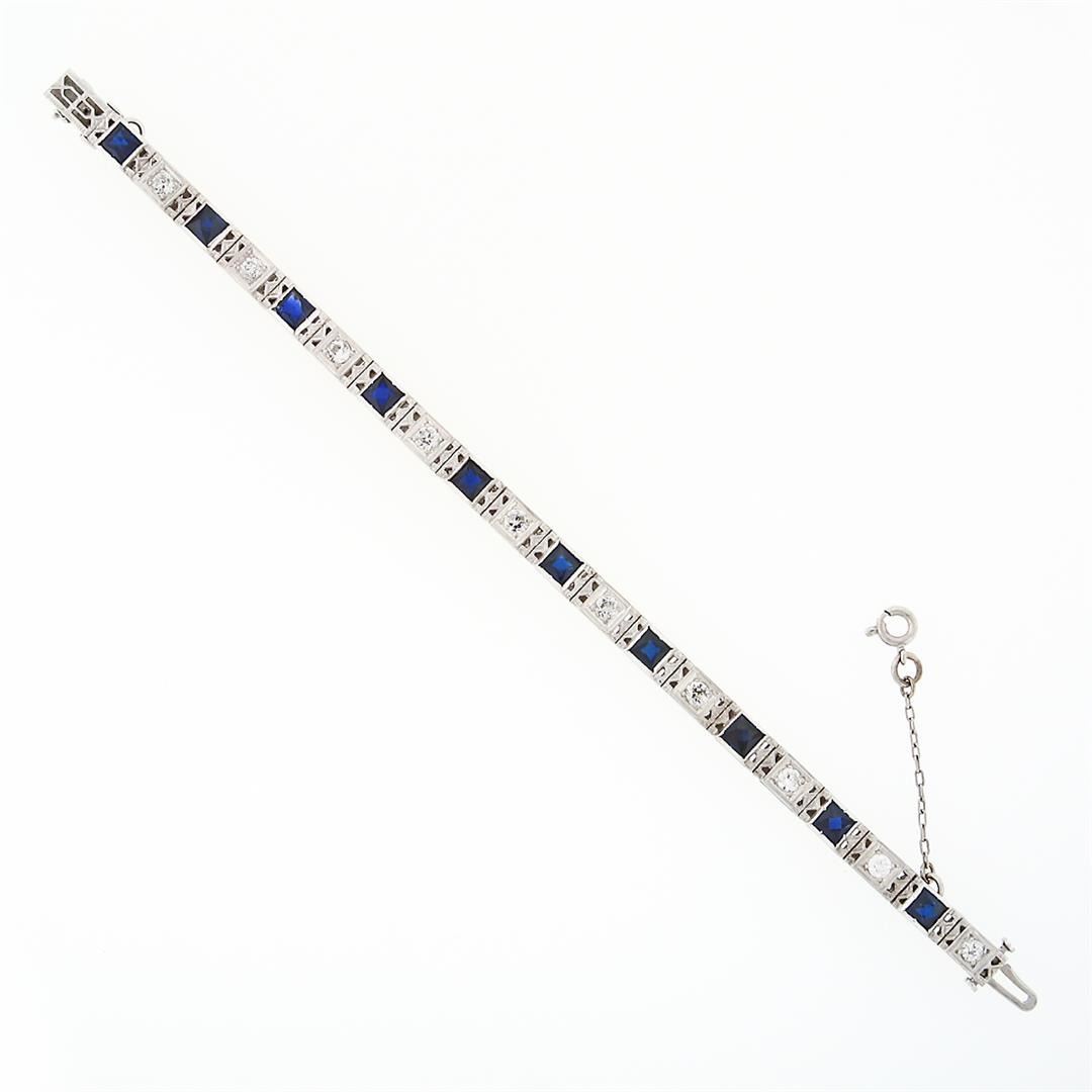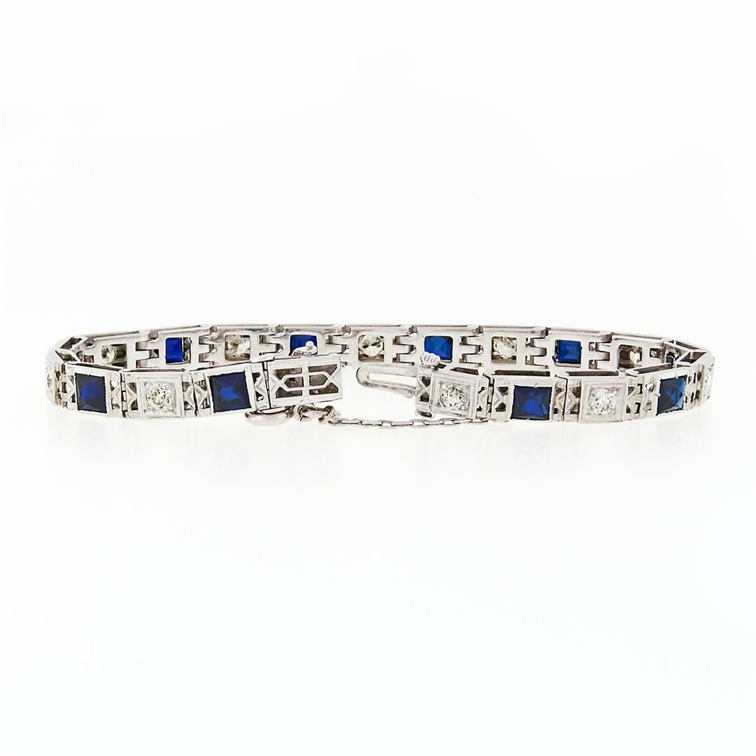 An art deco period solid 18k white gold line bracelet, with 10 old European cut natural diamonds (G/H - VS1/VS2; 1.10ctw), and 10 square french cut synthetic sapphire (3.5mm). It weighs a total of 12.77 grams, measures 4.85mm wide, and measures 5.75 inches in length.