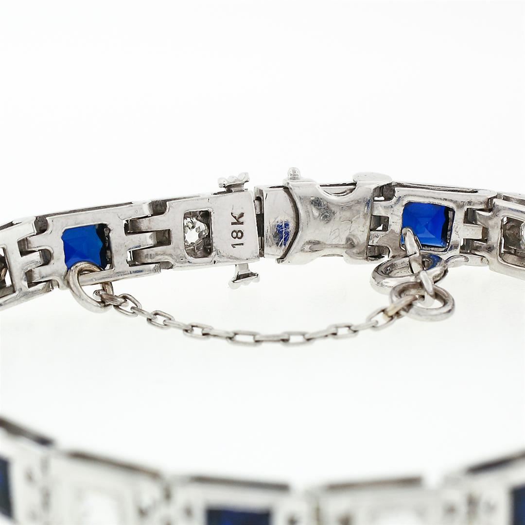 An art deco period solid 18k white gold line bracelet, with 10 old European cut natural diamonds (G/H - VS1/VS2; 1.10ctw), and 10 square french cut synthetic sapphire (3.5mm). It weighs a total of 12.77 grams, measures 4.85mm wide, and measures 5.75 inches in length.