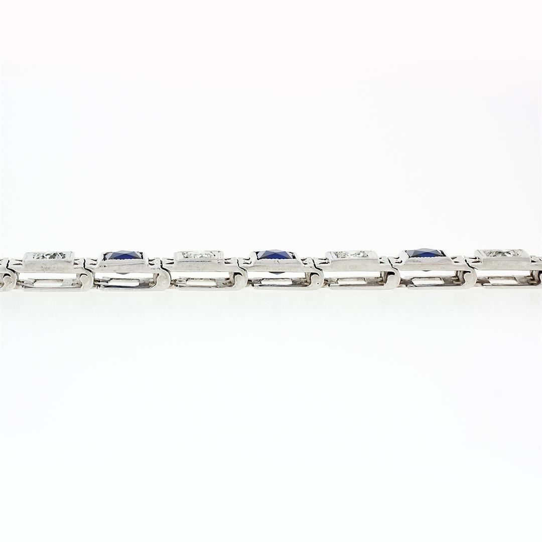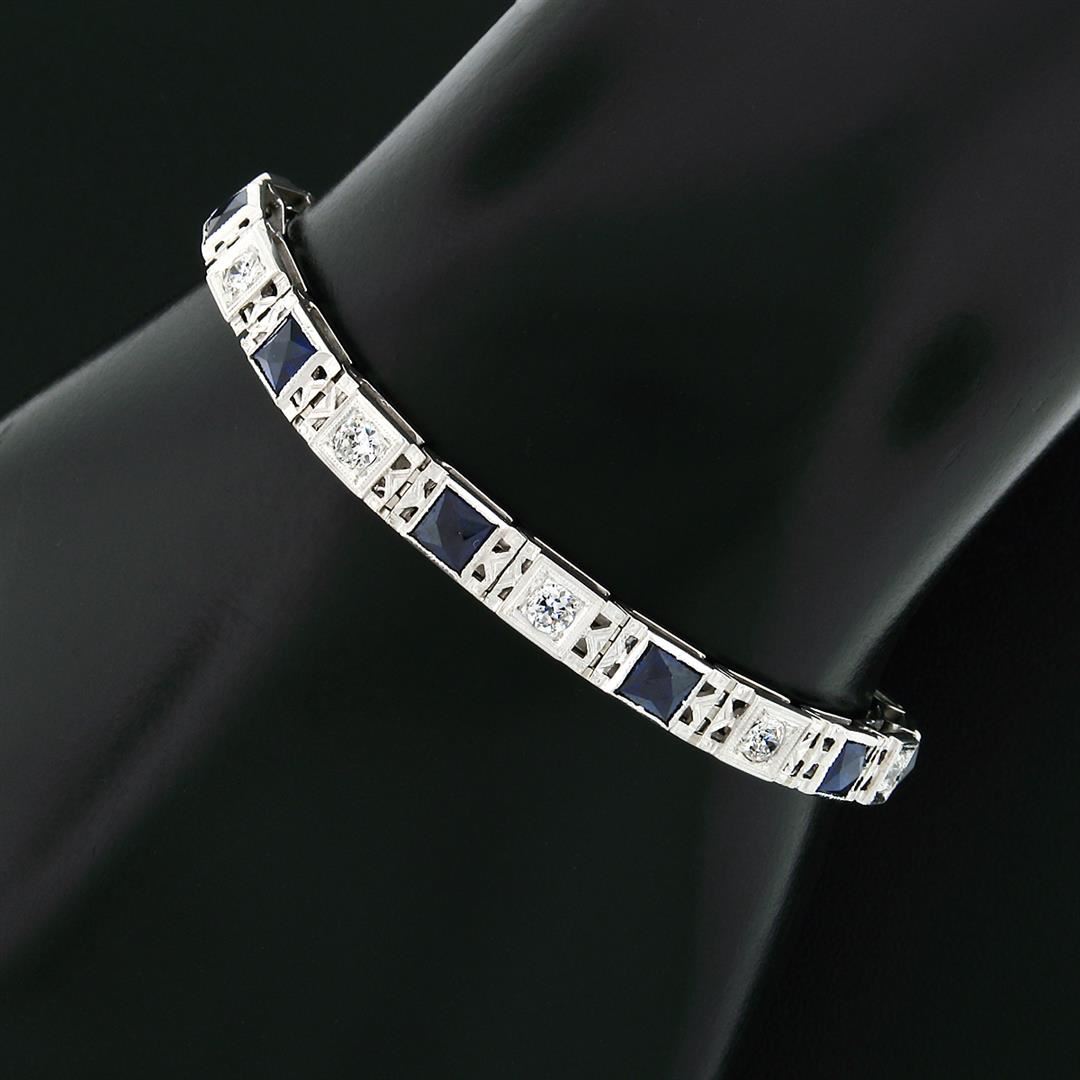 An art deco period solid 18k white gold line bracelet, with 10 old European cut natural diamonds (G/H - VS1/VS2; 1.10ctw), and 10 square french cut synthetic sapphire (3.5mm). It weighs a total of 12.77 grams, measures 4.85mm wide, and measures 5.75 inches in length.