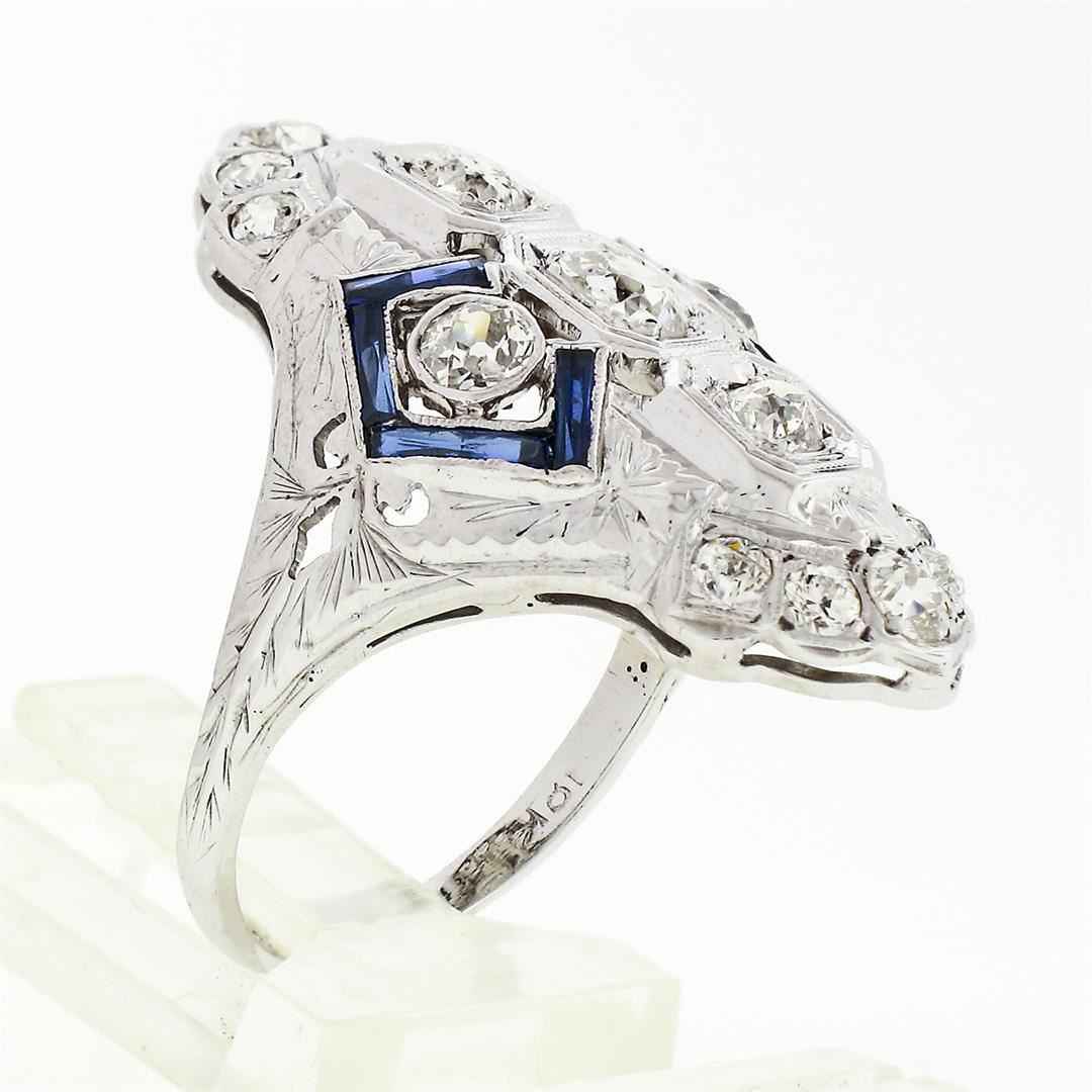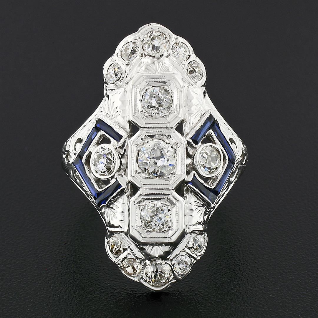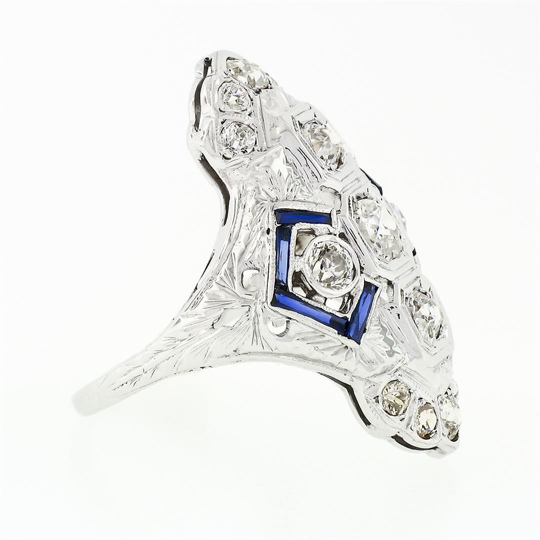 An antique solid 18k white gold long dinner ring, with 15 old european cut natural diamonds (G/H - VS2/SI2; 1.13ctw), and 8 baguette french cut synthetic sapphires. The ring is size 6.5, weighs a total of 4.39 grams, and measures 27.8mm wide.