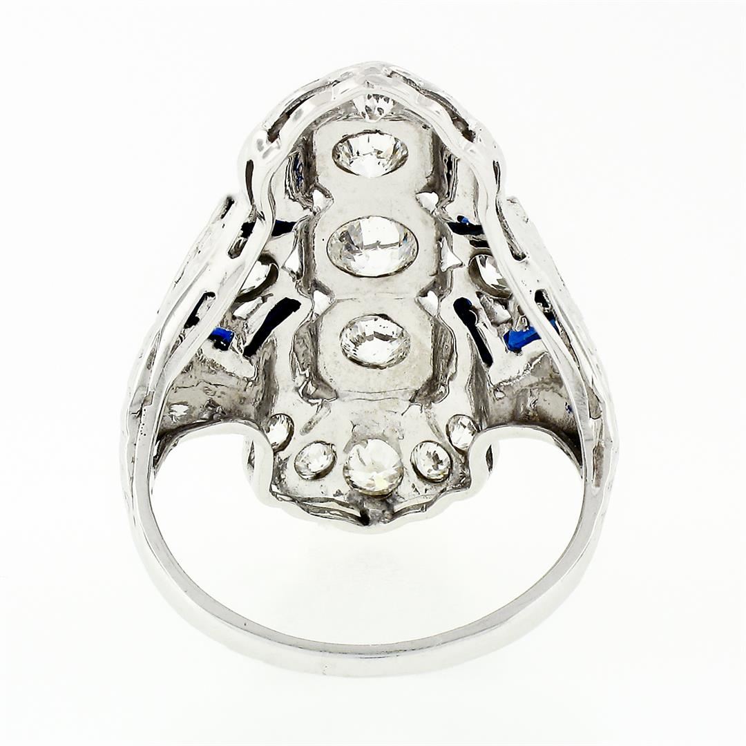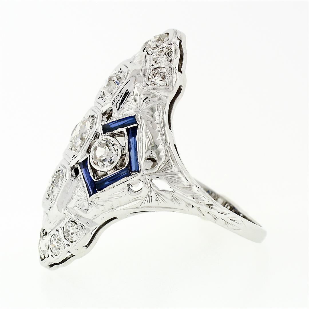 An antique solid 18k white gold long dinner ring, with 15 old european cut natural diamonds (G/H - VS2/SI2; 1.13ctw), and 8 baguette french cut synthetic sapphires. The ring is size 6.5, weighs a total of 4.39 grams, and measures 27.8mm wide.