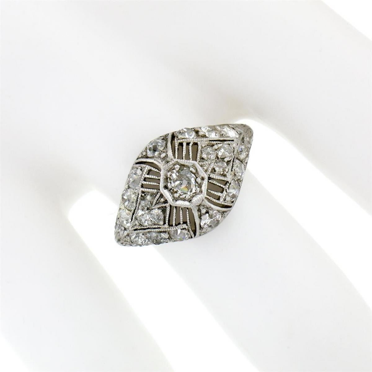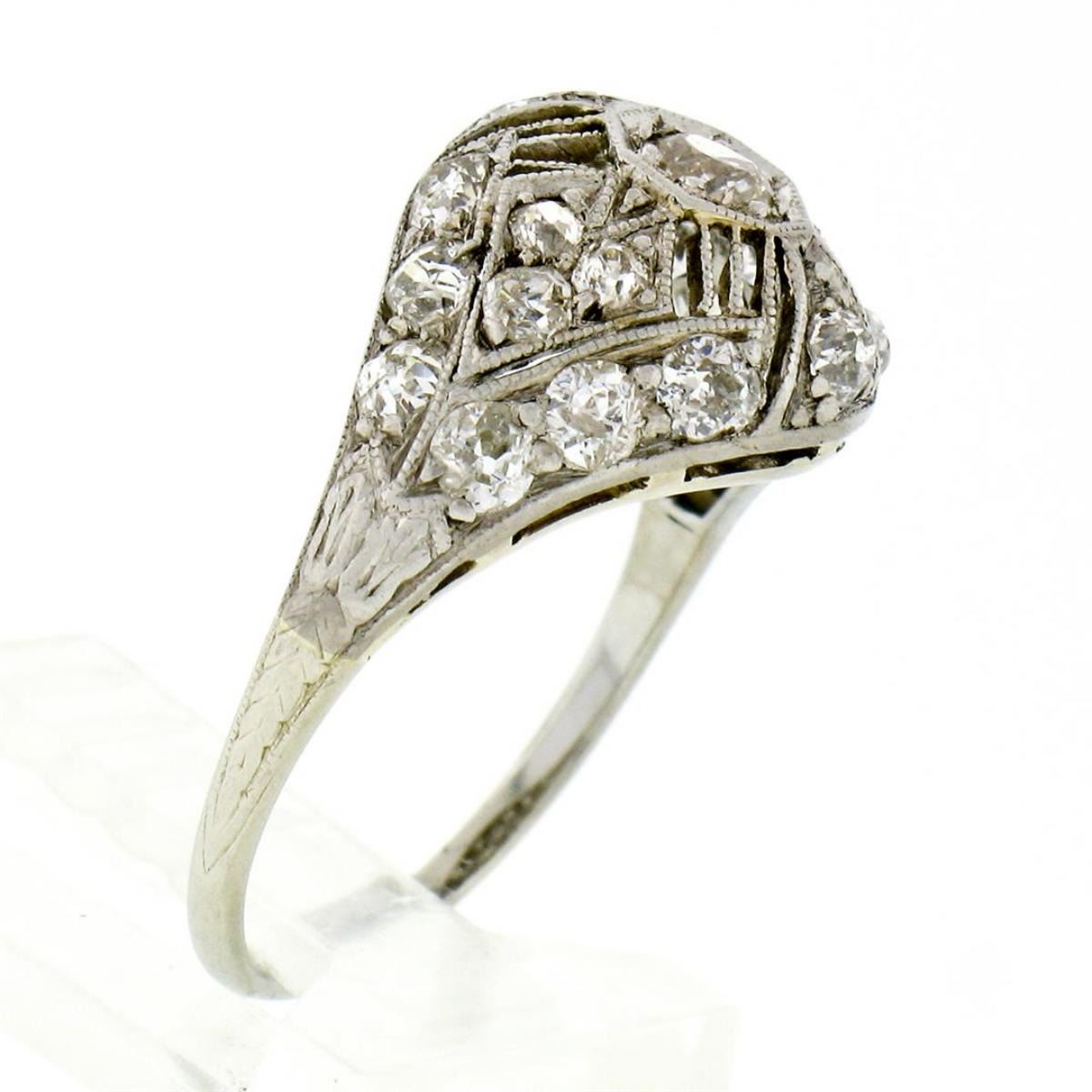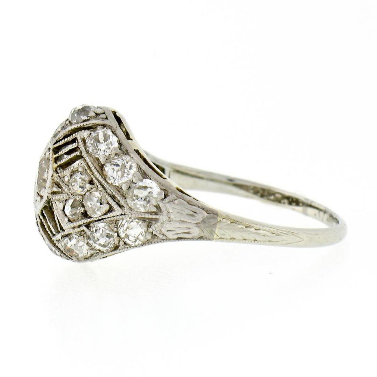 Antique Art Deco 18k Gold 1ct Old Cut Diamond Dome Filigree Dinner Cocktail Ring. A solid 18k white gold art deco period domed cocktail ring with 21 old European and mine cut natural diamonds (G to I - VS1 to SI2; 1.00ctw). The ring is size 6.5, weighs a total of 2.43 grams, and measures 11.5mm wide.