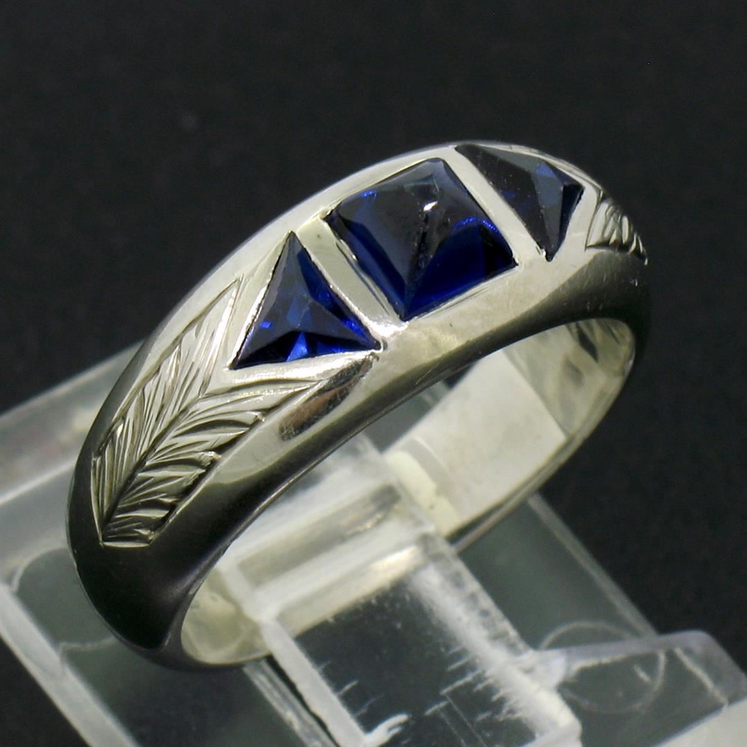 An antique solid 18k white gold band ring, with 1 sugarloaf cabochon cut natural sapphire (0.55ct), with 2 french trillion cut natural sapphires (0.35ctw). The ring is size 4.5, weighs a total of 5.38 grams, and measures 6.70mm wide.