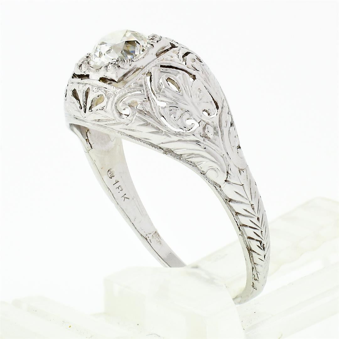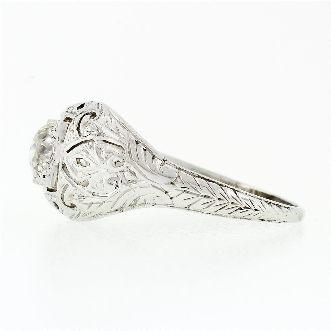 An art deco period solid 18k white gold filigree engagement ring, with 1 old European cut natural diamond (I - SI1; 0.52ct). The ring is size 7.0, weighs a total of 2.42 grams, and measures 9.8mm wide.