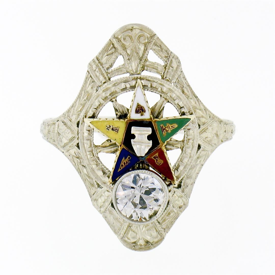 An antique solid 18k white gold enamel masonic dinner ring, with 1 old european cut natural diamond (F - VS1; 0.35ct). The ring is size 4.5, weighs a total of 4.17 grams, and measures 20.3mm wide.