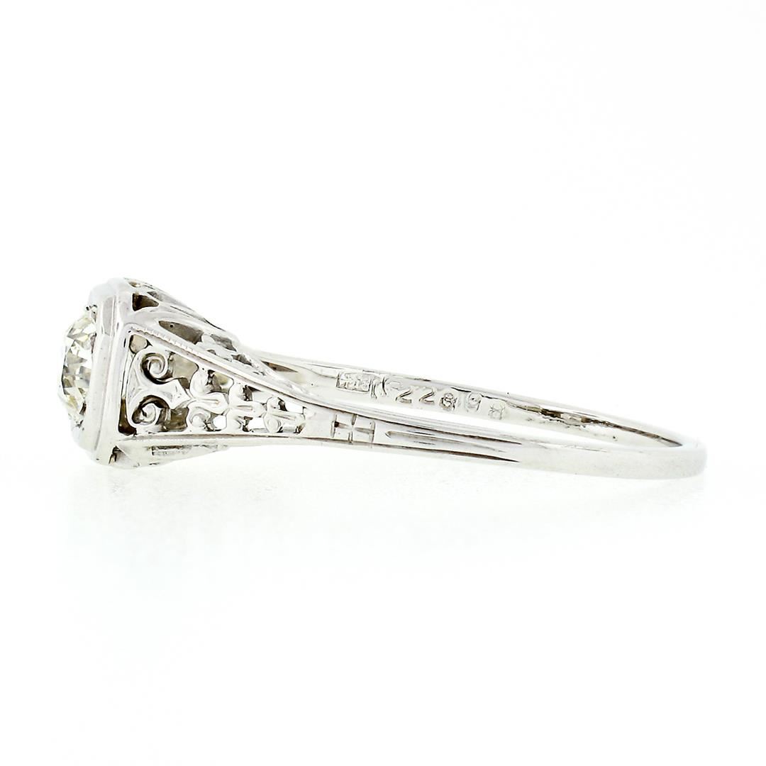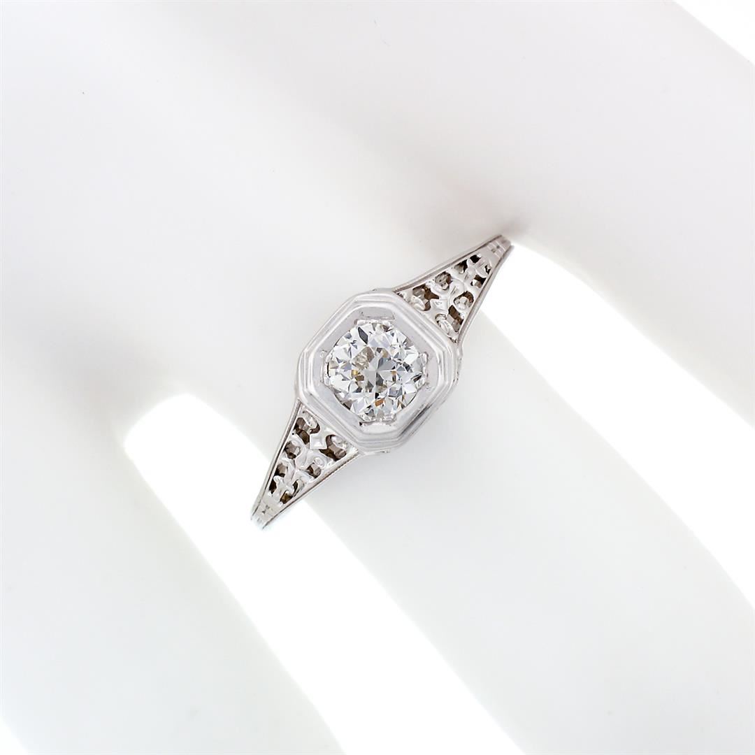 An art deco period solid 18k white gold engagement ring, with 1 old European cut natural diamond (I/J - VVS2; 0.45ct). The ring is size7.5, weighs a total of 2.29 grams, and measures 7.1mm wide.