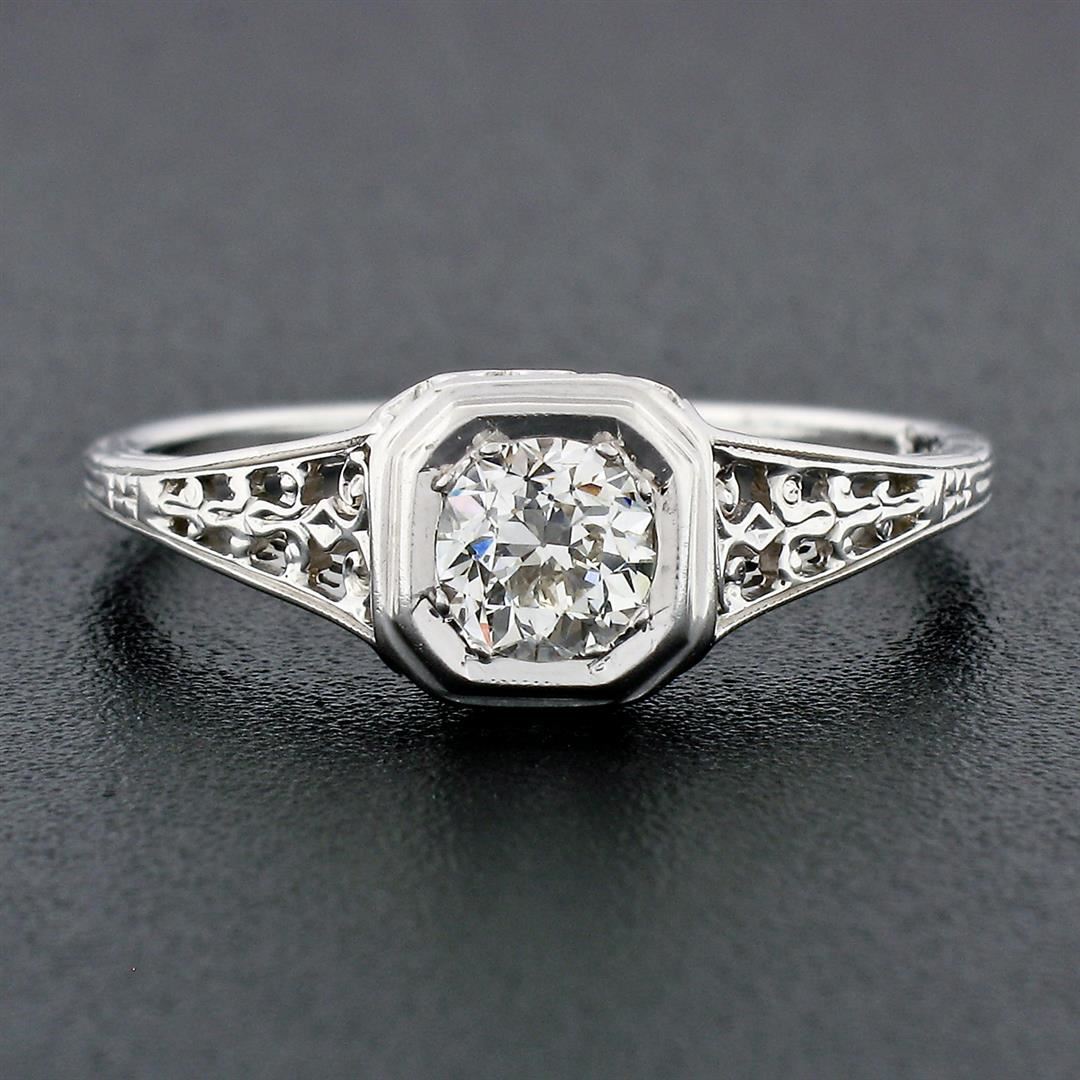 An art deco period solid 18k white gold engagement ring, with 1 old European cut natural diamond (I/J - VVS2; 0.45ct). The ring is size7.5, weighs a total of 2.29 grams, and measures 7.1mm wide.