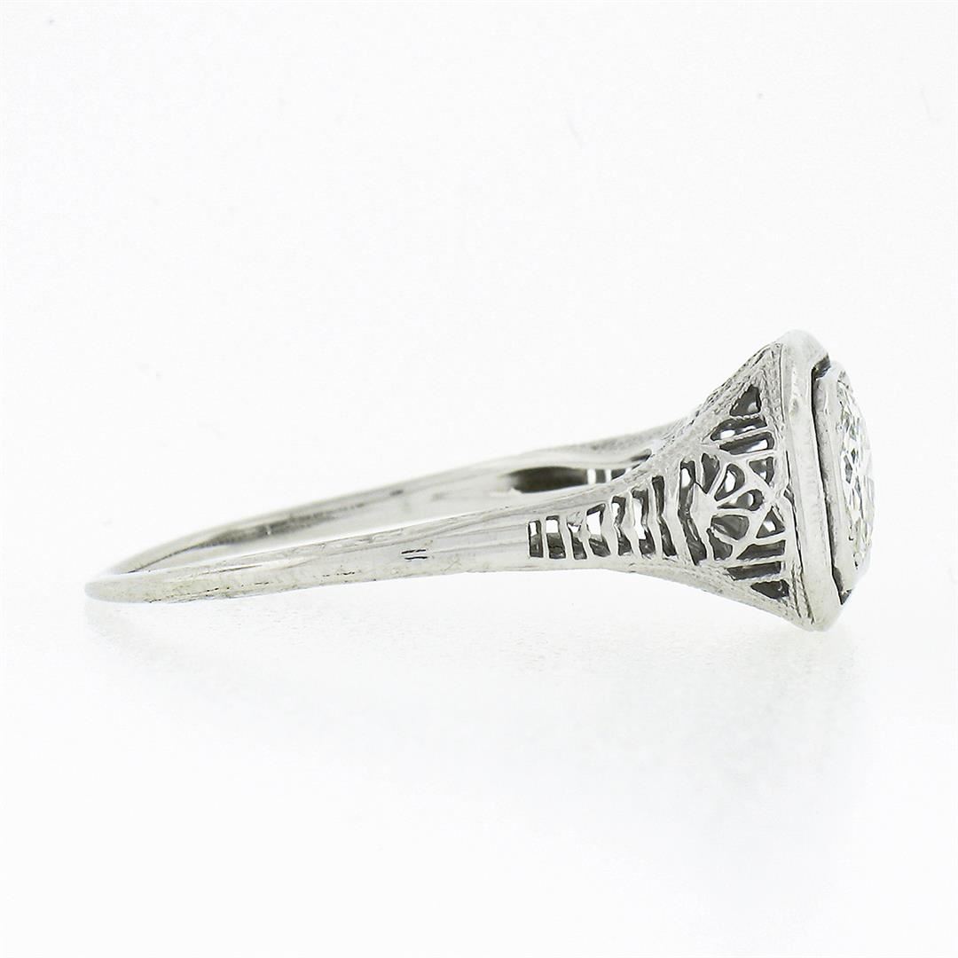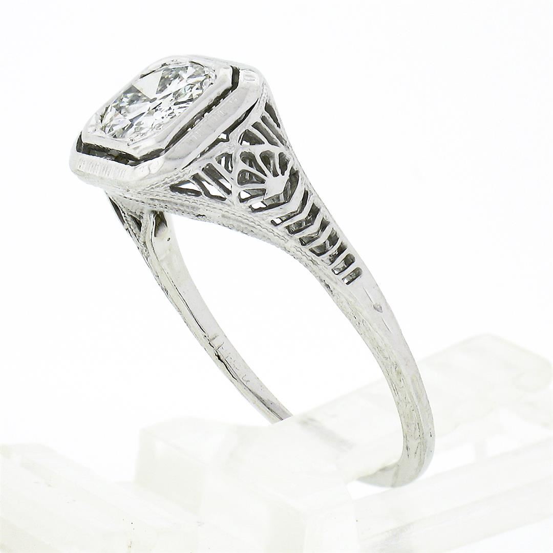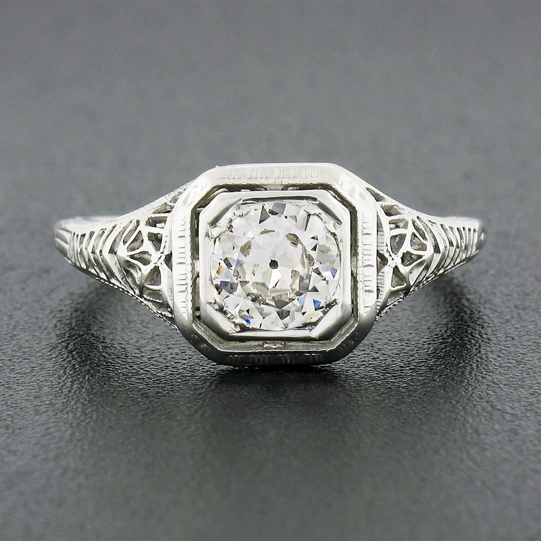 An antique solid 18k white gold ring, with 1 old european cut natural diamond (H/I - SI1 ; 0.80ct). The ring is size 6.0, weighs a total of 2.11 grams, and measures 8.80mm wide.