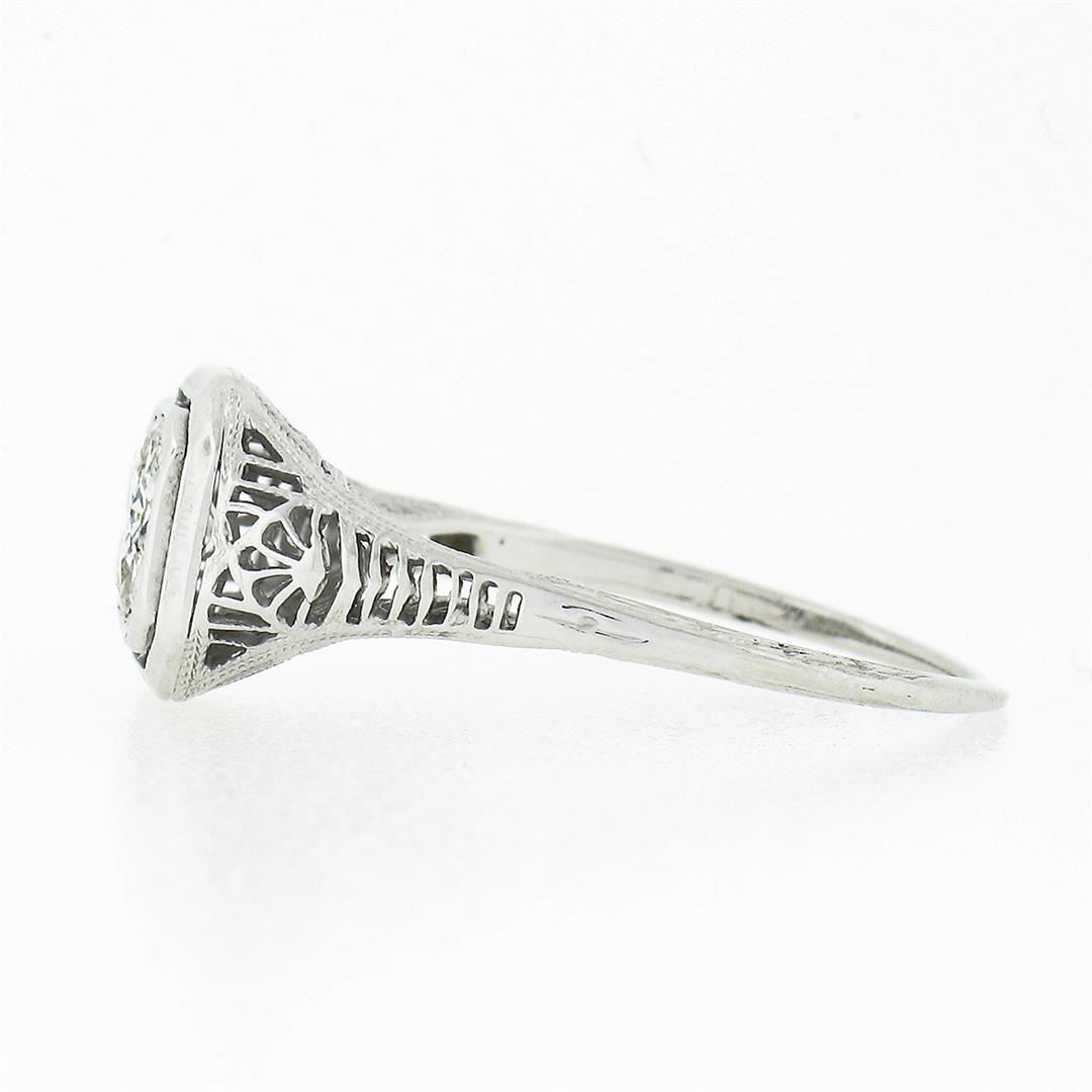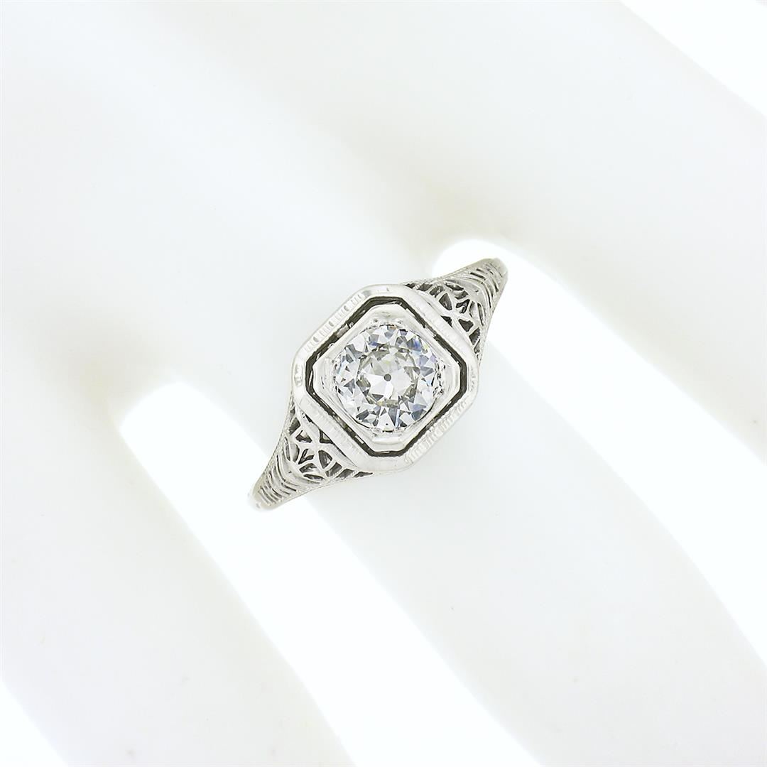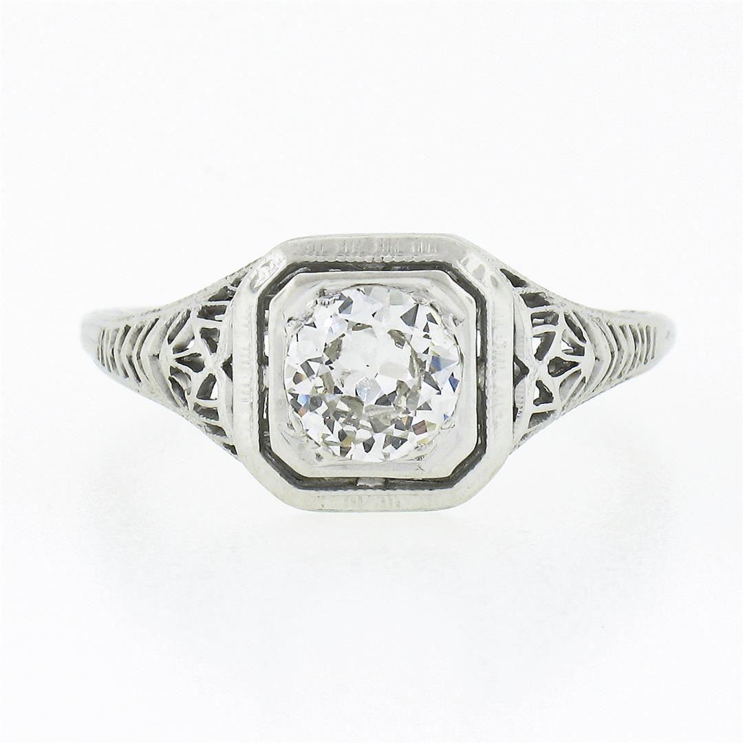 An antique solid 18k white gold ring, with 1 old european cut natural diamond (H/I - SI1 ; 0.80ct). The ring is size 6.0, weighs a total of 2.11 grams, and measures 8.80mm wide.