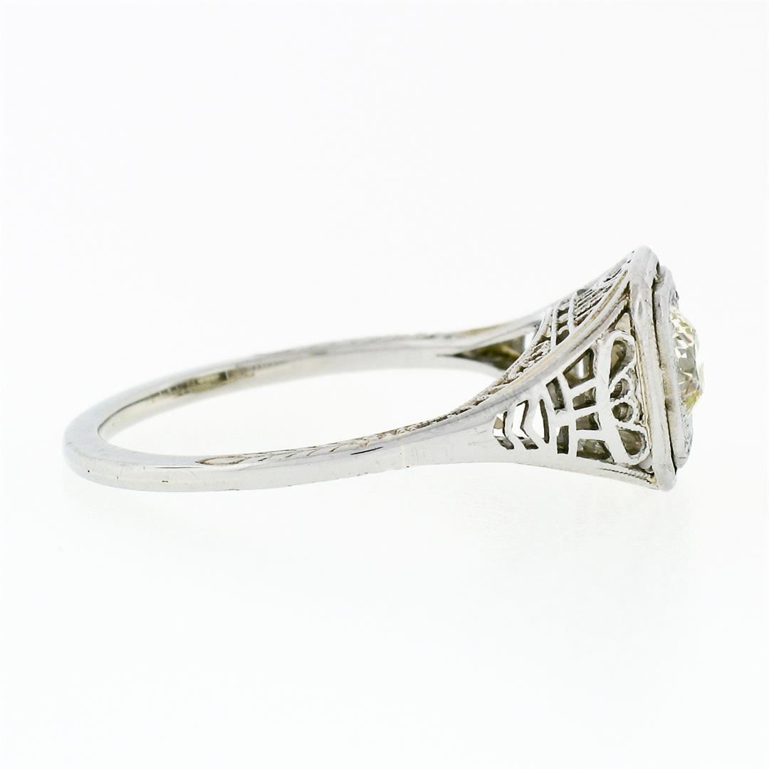 An art deco period solid 18k white gold filigree engagement ring with 1 old European cut natural diamond (fancy light yellow - VS2; 0.32ct). The ring is size 6.0, weighs a total of 2.07 grams, and measures 8.25mm wide.