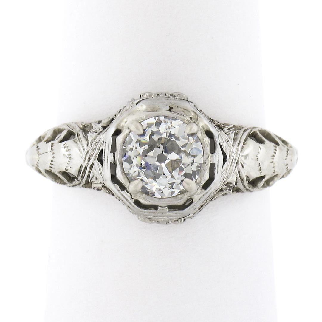 An antique solid 18k white gold engagement ring, with 1 GIA graded old european cut natural diamond (J - VS2 ; 0.94ct). The ring is size 6.0, weighs a total of 3.06 grams, and measures 9.70mm wide. Comes with all original relevant certifications.